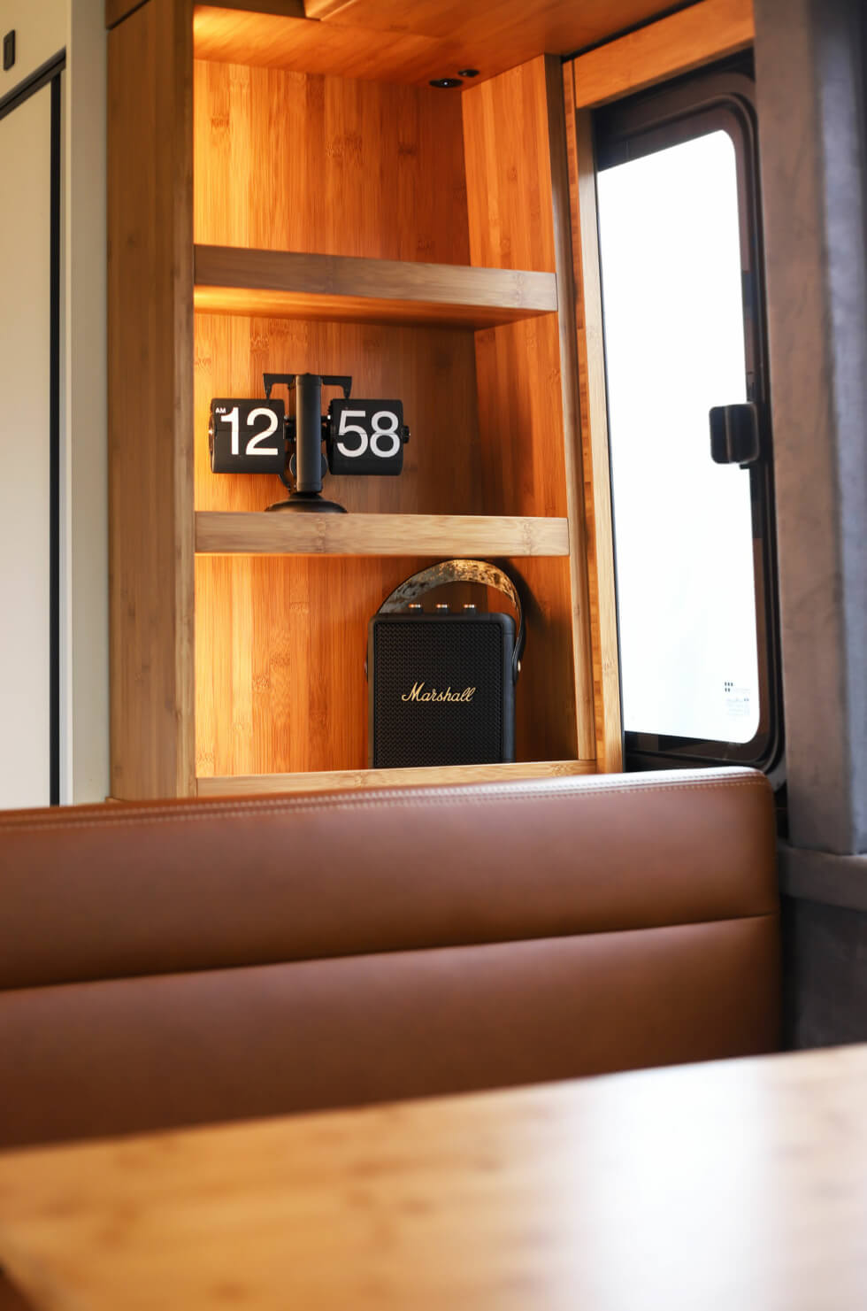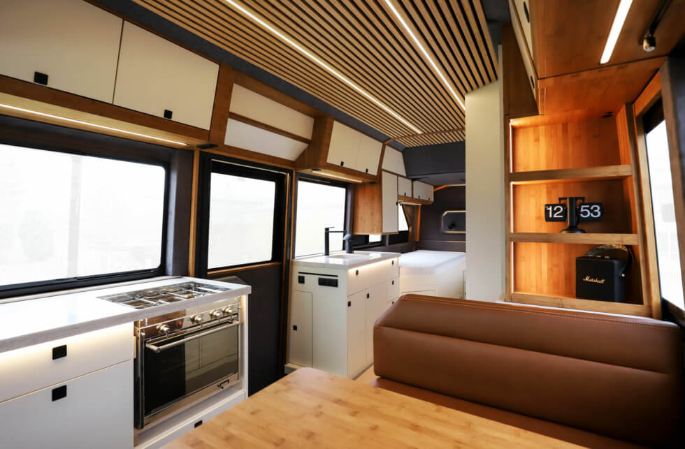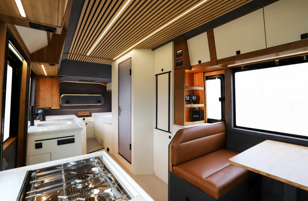 As rugged as it seems, this RV is not lacking in versatility and creature comforts. Large windows run along almost the entire lenght of its body. Therefore, everyone can easily view the surrounding landscapes, while plenty of natural illumination filters in by day. To the rear of the cabin are two long beds that can combine into a single king-size bed.