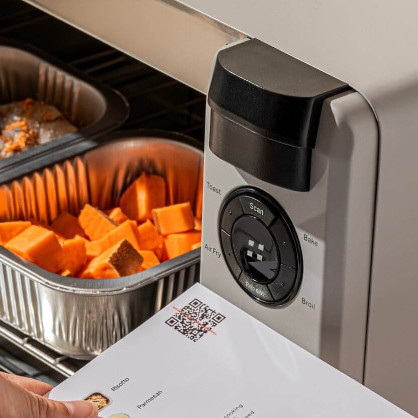 It’s a 6-in-1 oven with Steam, Air Fry, Bake, Broil, Toast, and Reheat options for easy and efficient food preparation. Its built-in QR-based system lets you scan QR codes from food packages for suggestions on best cooking method. You can also pick from a preset of recipes from the Tovala app’s recpe library.
