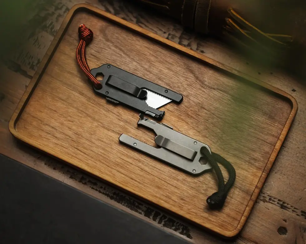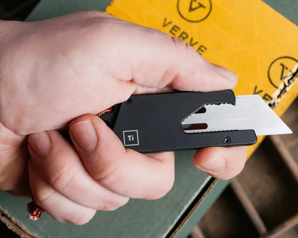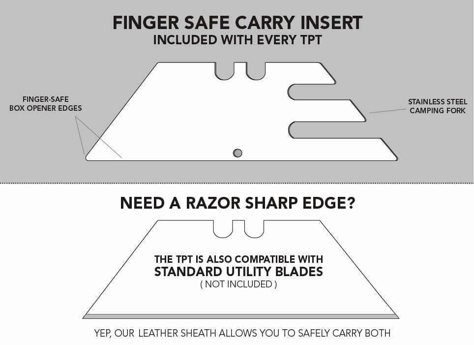 The TPT Slide EZ Swap also has a stainless steel insert that functions as a scraper, package opener, and camping fork. But if you decide to ditch the insert, then this tool is also compatible with standard-sized razor blades, making it a compact utility knife.