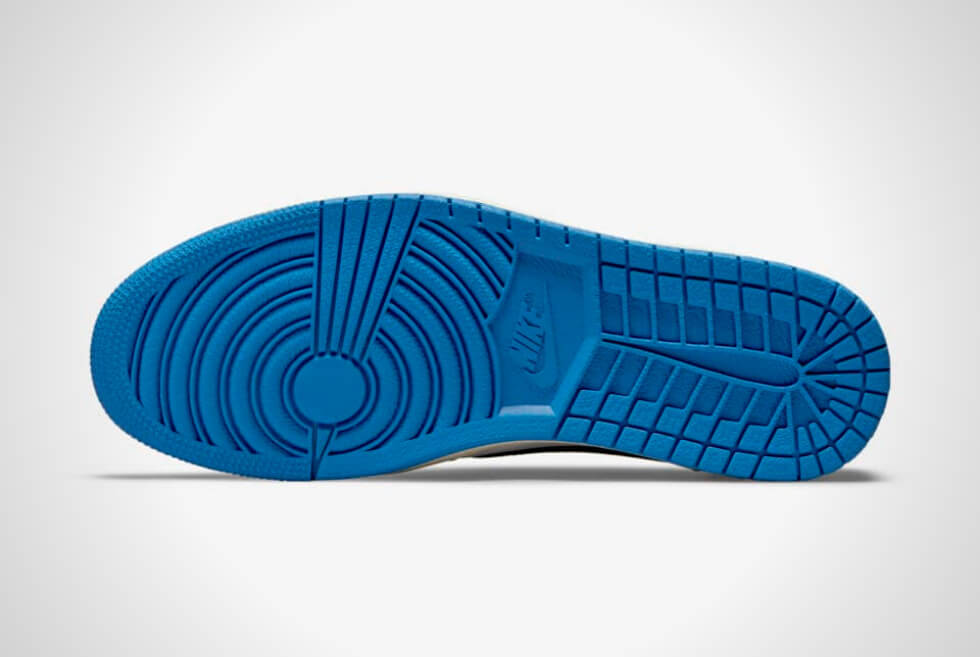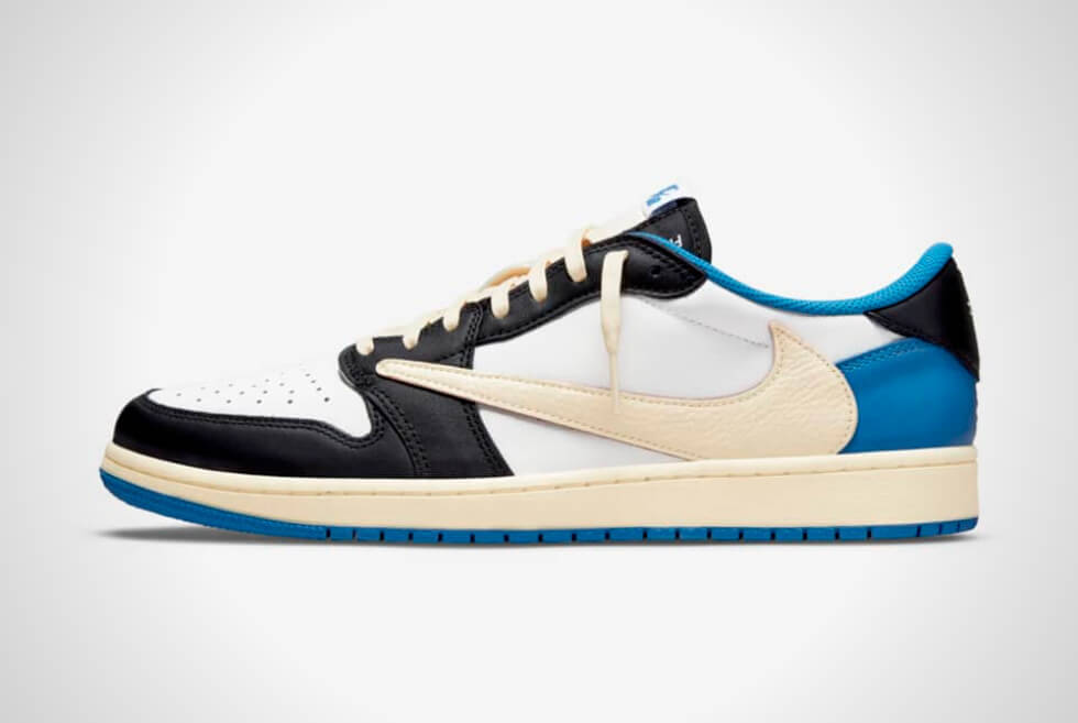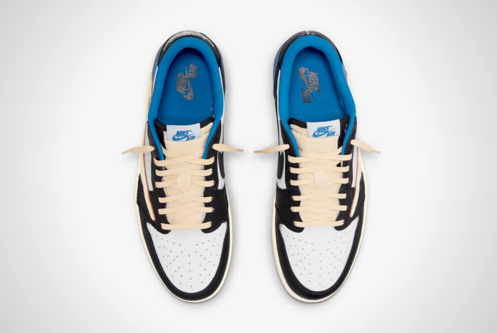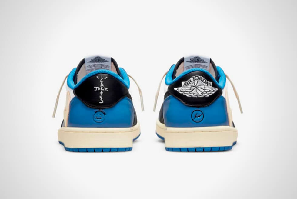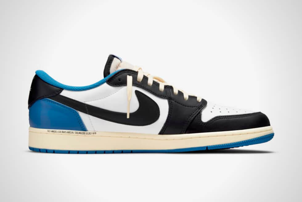 Shades of Military Blue are on the heel, collar, lining, insole, and outsole. The Travis Scott x Fragment Air Jordan 1 Low then features laces, a reverse Swoosh logo on the lateral sides, and an aged midsole in the shade of sail. The Swoosh logos on the medial sides are in black and are in the original direction. We also like how they are keeping the co-branding subtle here.