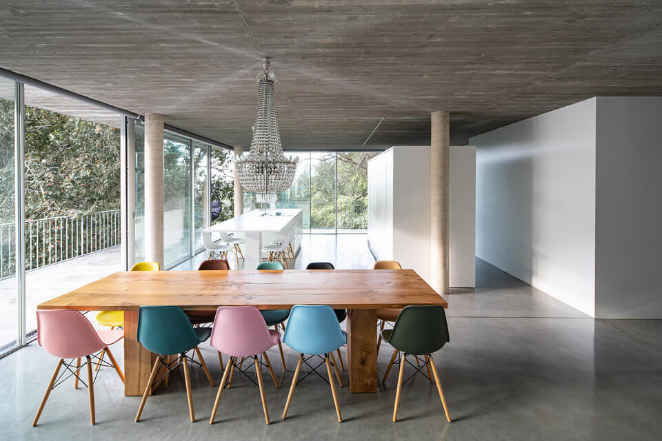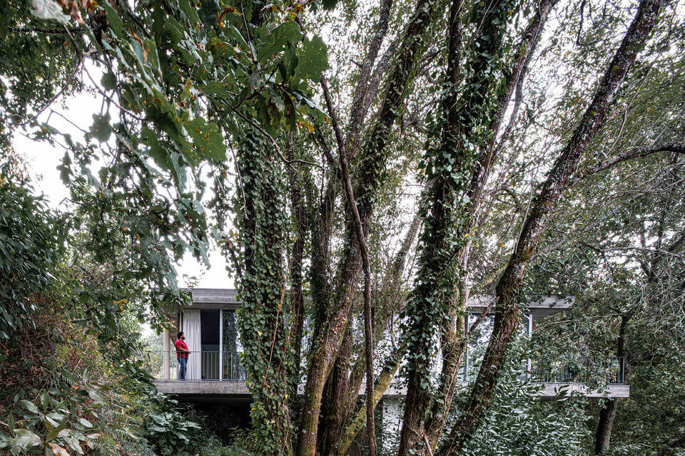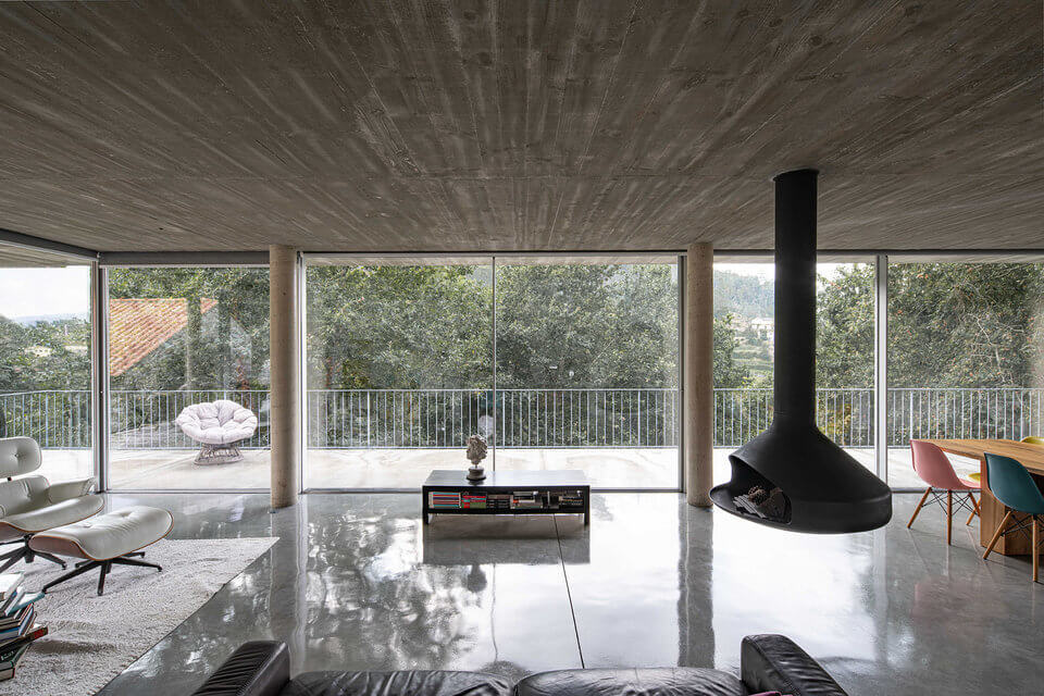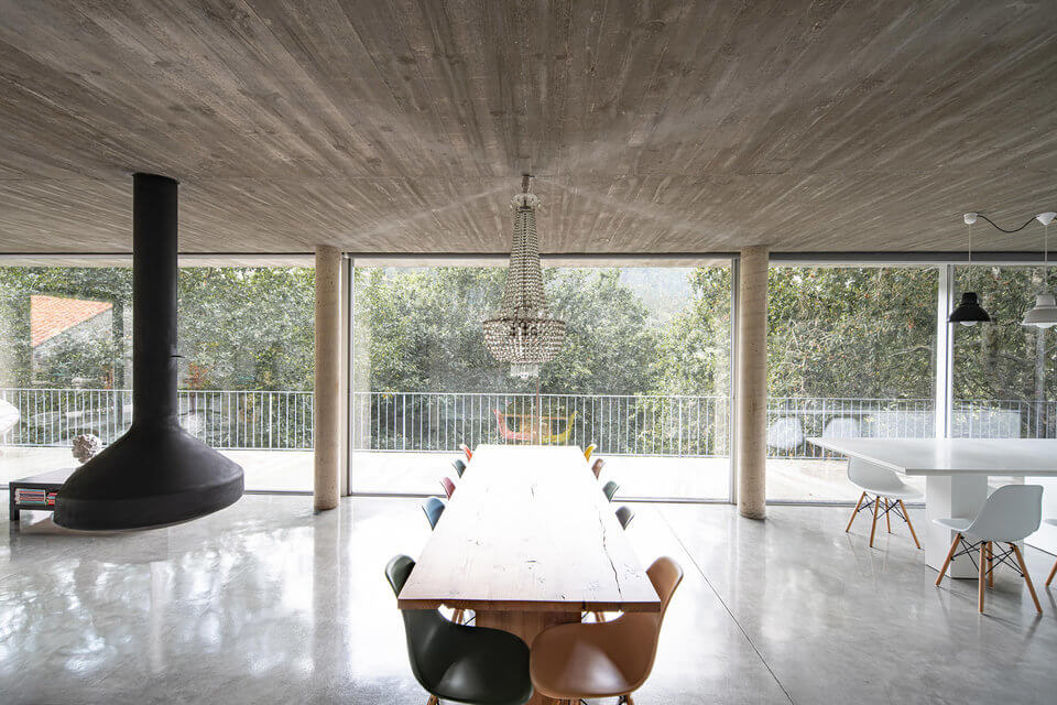 Tucked in a dense forest in Portugal inhabited by century-old oaks, olive, and chestnuts, this house builds upon an open floor plan. This allows for uninterrupted views of the surrounding greenery and for natural air to penetrate the interior living spaces.