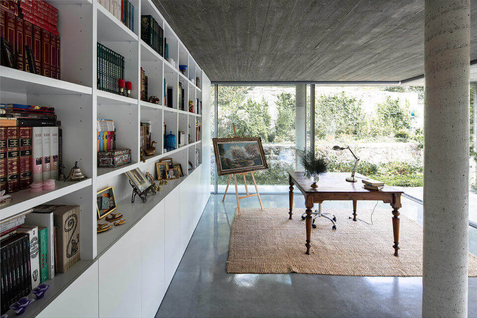 Moreover, this minimalist abode uses concrete materials and relies on the changing season to bring out the foliage of the trees and in turn, color the muted gray tones used for the structural paint. The colors from the vegetation, pieces of furniture, books, and other decorations also serve to add color to the interior.