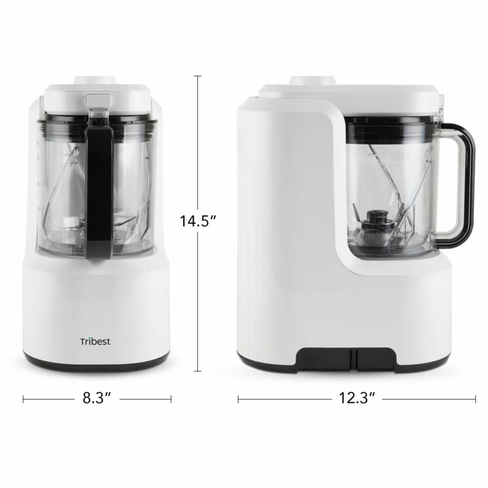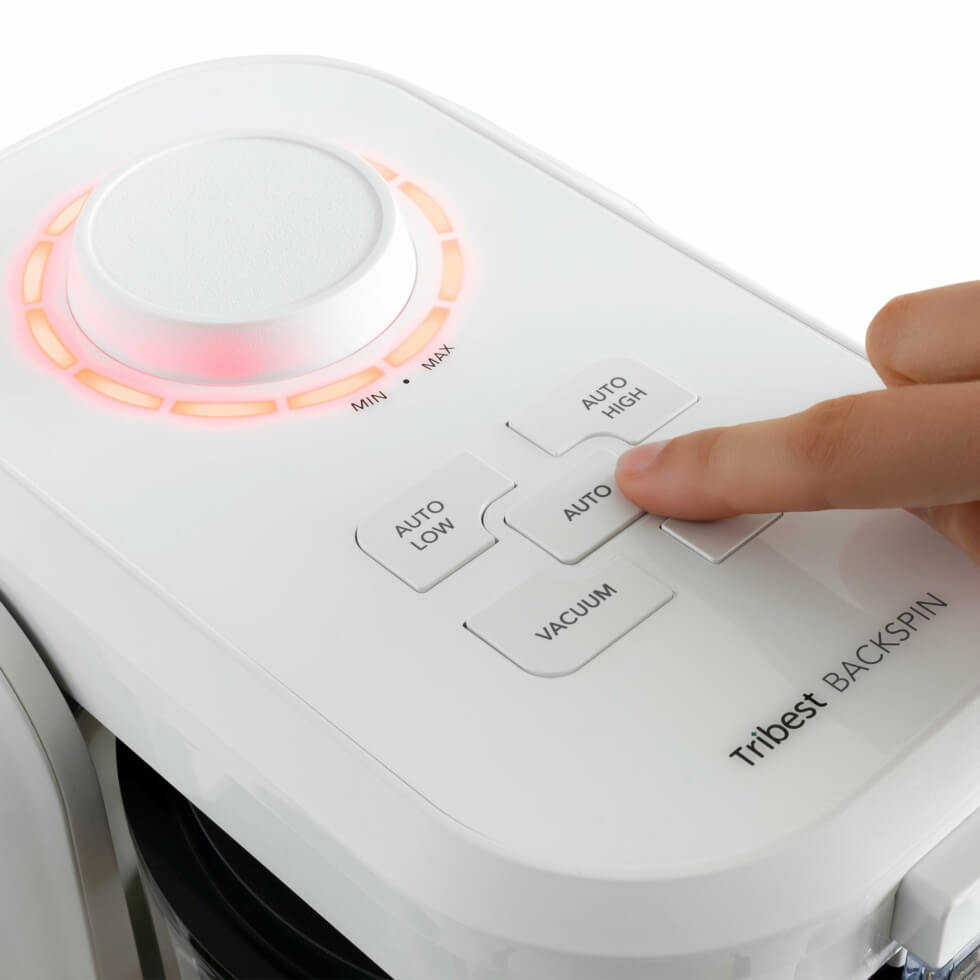 Tribest’s Backspin blender features 12 variable speeds easily adjustable with a simple turn. The LED illuminates the speed levels. Meanwhile, five presets cater to a wide array of ingredients: Auto, Auto Low, Auto High, Vacuum, and Pulse. This machine runs on a powerful 900W motor and has magnetic stainless steel blades for easy cleanup.