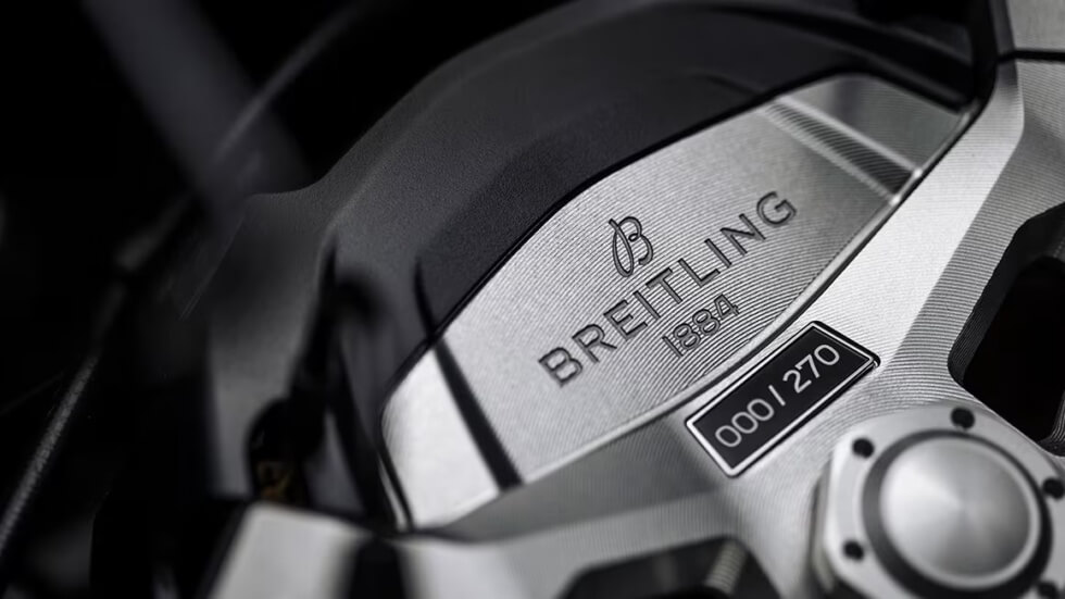 Its body is adorned with a special metallic paint scheme, sophisticated detailing, hand-painted coach lining, and the Breitling script. Other distinct cosmetic tweaks include the leather saddle with a French stitching and Breitling logo on the billet machined rear wheel finisher.