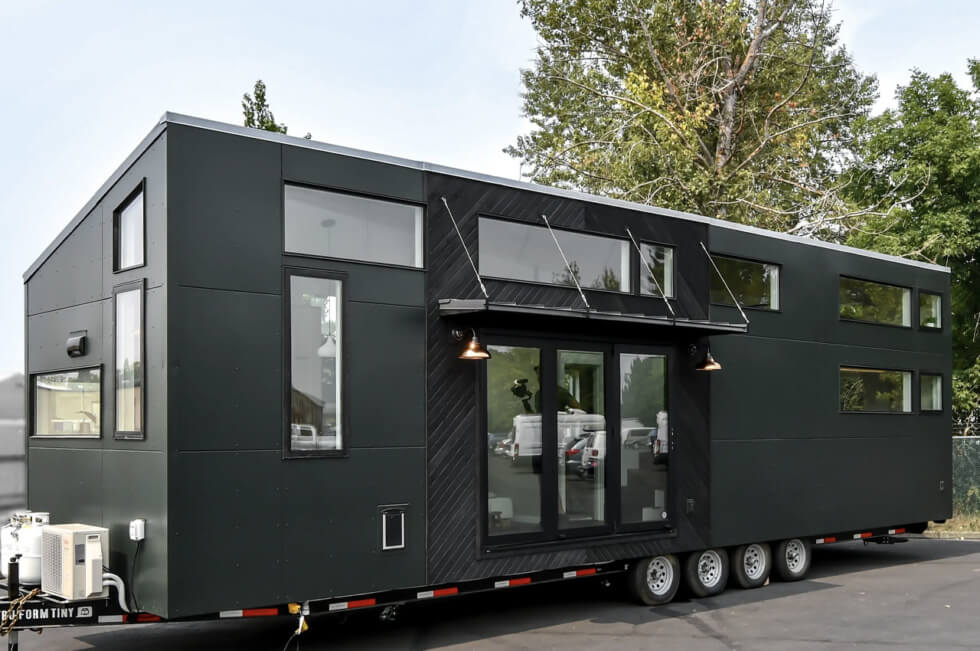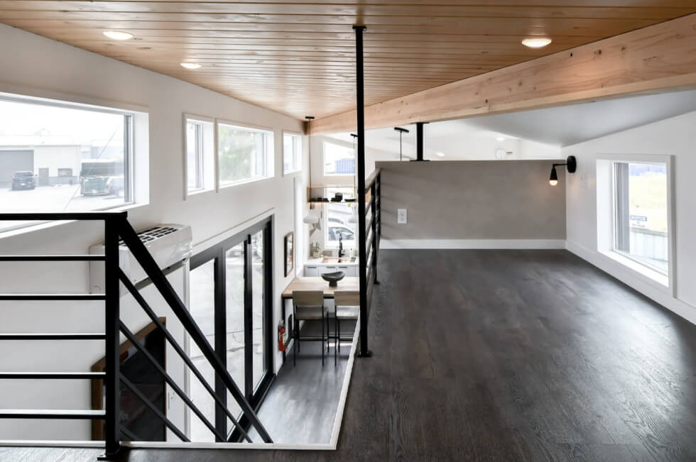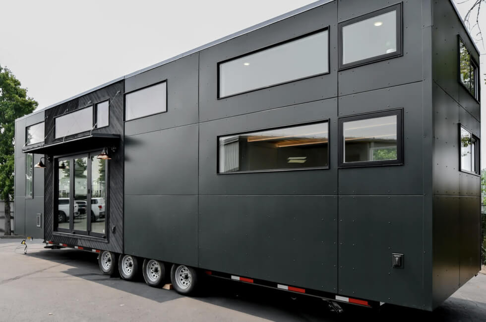 This is a build-to-order, customizable home measuring 37 feet long and features a large loft, storage stairs, folding door opening, a main floor master bedroom, and an open concept layout. When viewed from the inside, one would hardly think it’s a tiny home given its amenities. It’s contemporary and elegant and is very much apartment-esque, but founded on a quad-axle trailer.