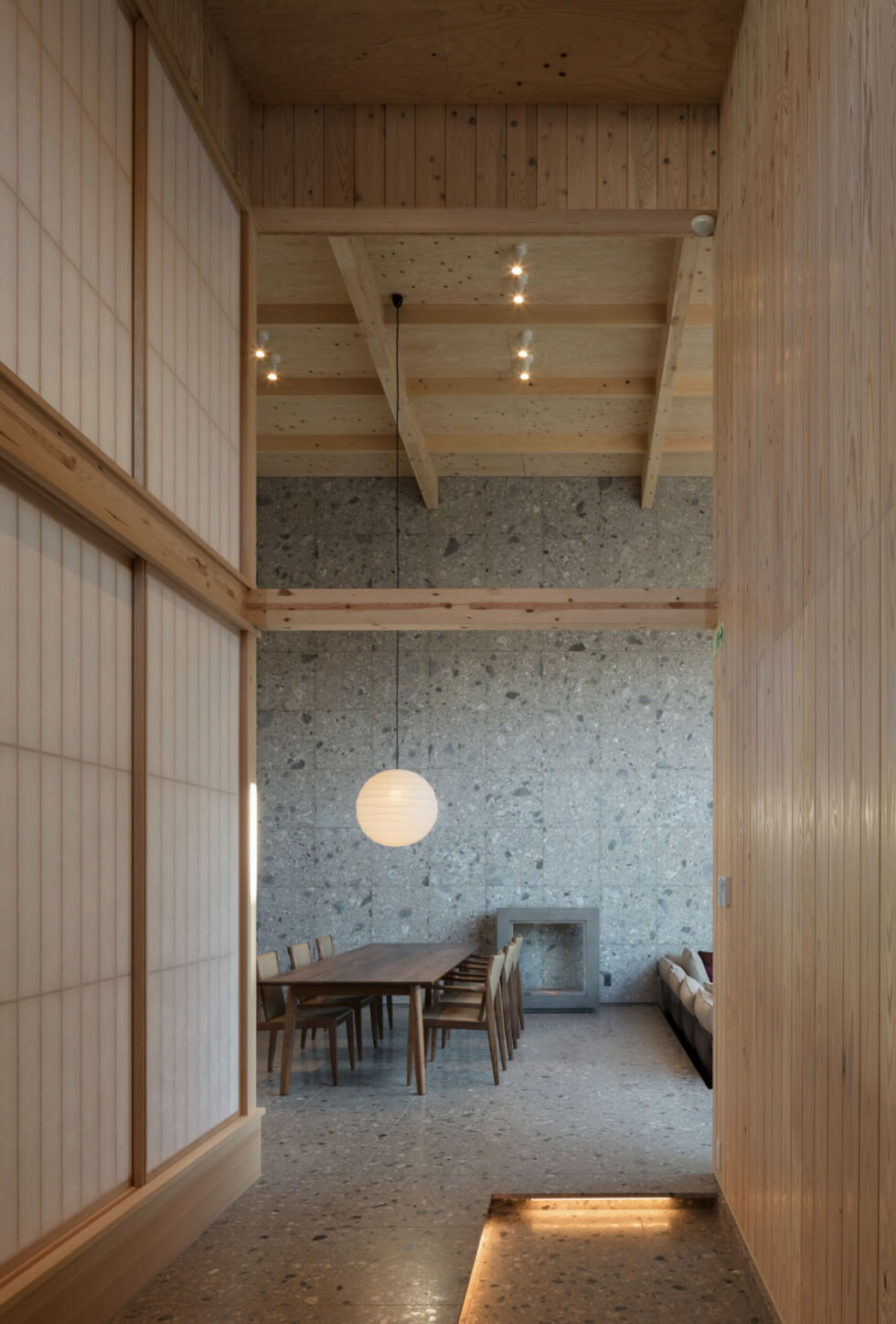 As with most Japanese houses, a shoe closest is immediately adjacent to the entrance. Residents and guests make it a point to take off their footwear as they enter any home. The layout shows a traditional room in the middle with tatami mats and shoji screens. The living room feels open with a towering ceiling and glazing. Finally, the extended roof overhangs provide a cool shade from the sun.
