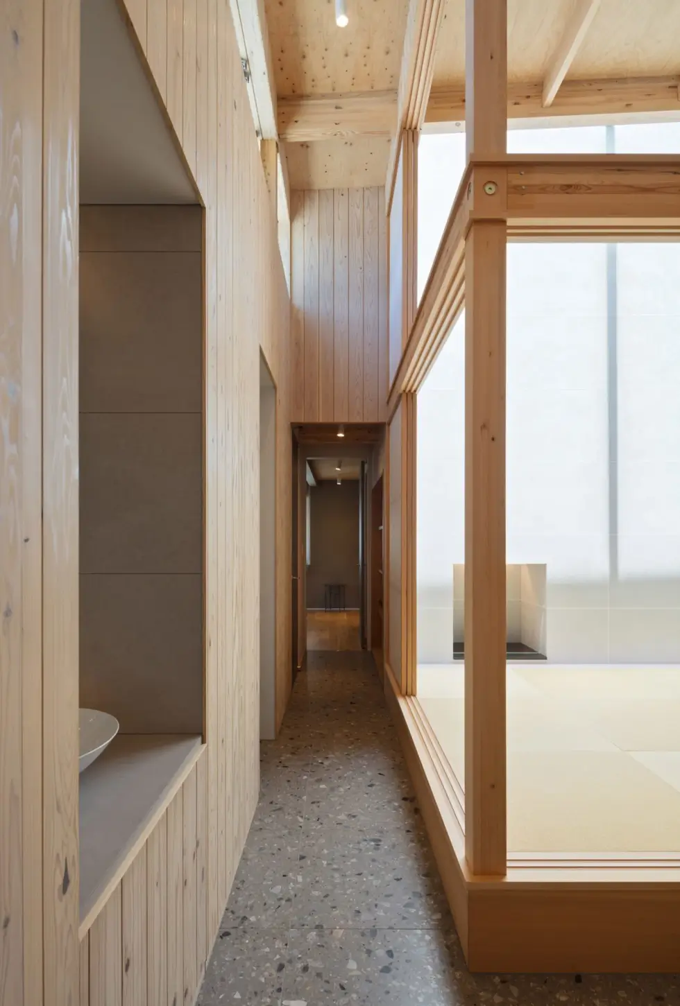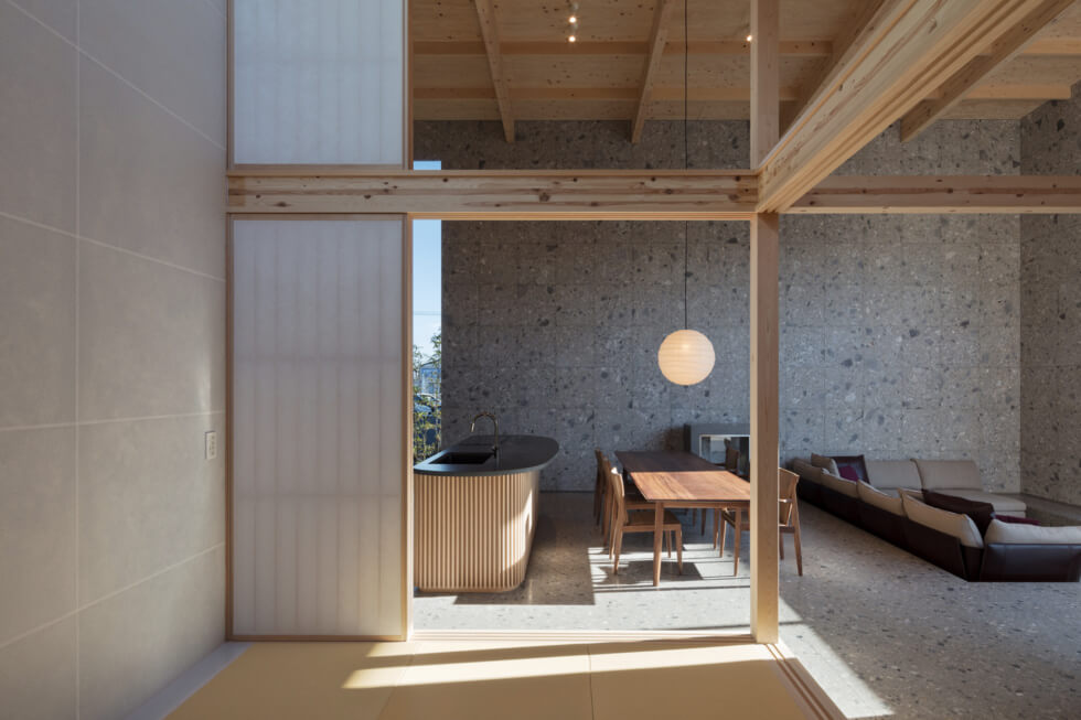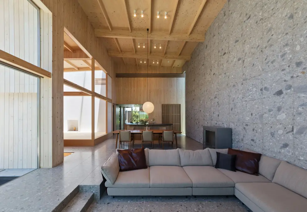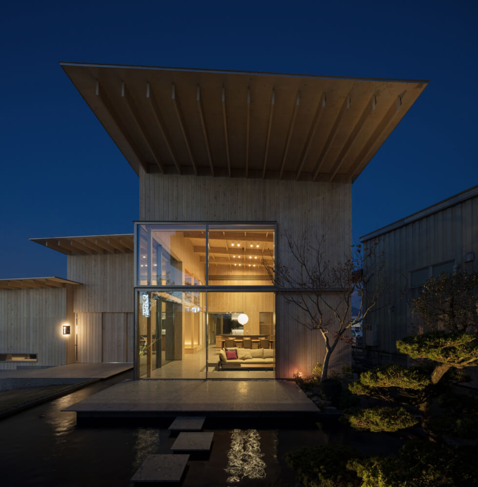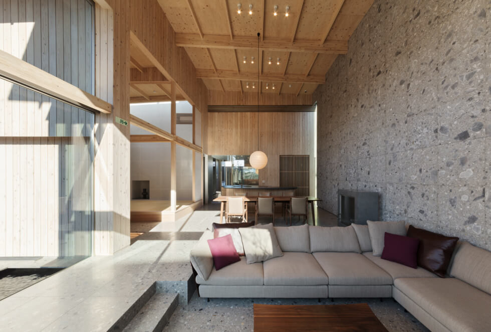 While some residences stand out among their surroundings, this one opts for the opposite with its humble timber-clad aesthetic. The façade allows the Tsumugu to appear traditional and understated enough to highlight its Zen-like motif. From the outside, it appears to be three separate volumes, but the inside tells a different story.