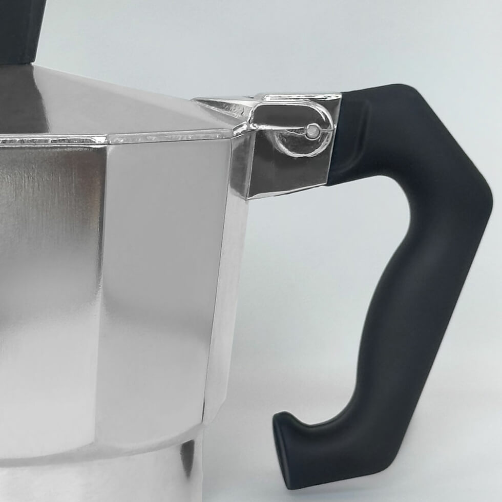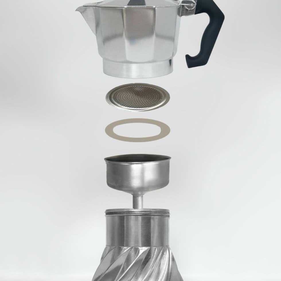 The Turbo Moka lives up to its name— it brews coffee in half the time of the traditional model while using less energy. That’s because of its spiral base, which optimizes heat distribution. It increases the surface area in contact with the flame by 93%, which means greater heat absorption and more energy distribution.