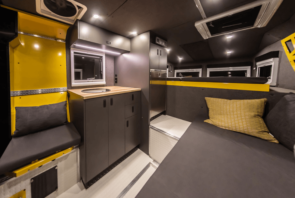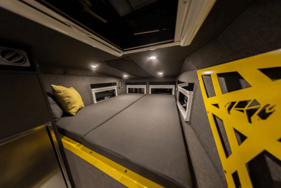 There’s a dinette, an ergonomic counter, a stainless-steel sink, and an induction cooktop. No need to rough it out when it comes to meals, but you can always step out and cook over a campfire for that rustic experience. To wrap up your day head over to the sleeping area and sleep on a queen-size bed. Go on and reach out to LOKI Basecamp for your FALCON series camper.