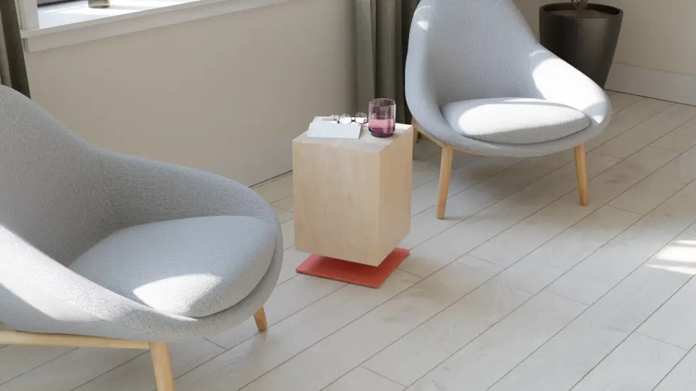 The Turno side table stays visually clean and serves as a coffee table when not in its engaged or raised form. It also comes in a compact footprint to minimize spacial visual clutter. It comes in bases in various color options that range from bold hues like coral and navy, to more neutral tones that blend into any interior setup.