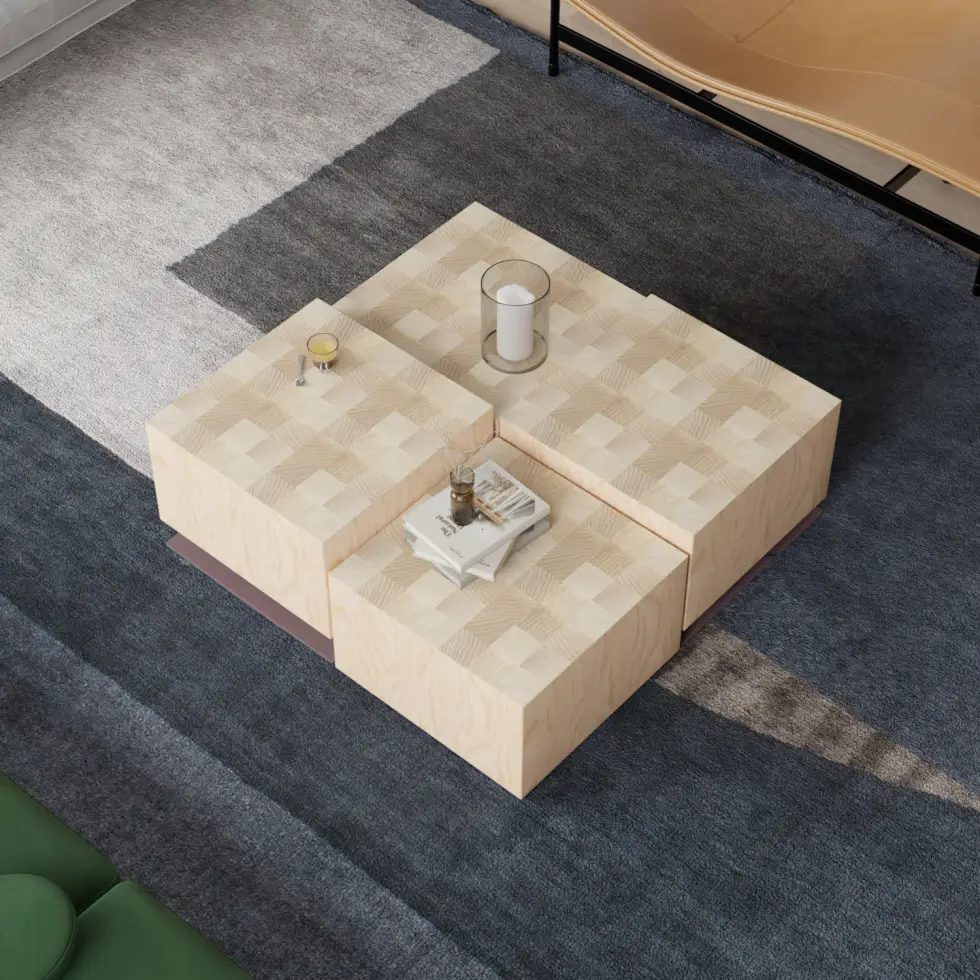 The table appears as one clean geometric form crafted from a solid block of maple wood. But it cleverly hides a twist-to-adjust mechanism in its framework to adjust its height.