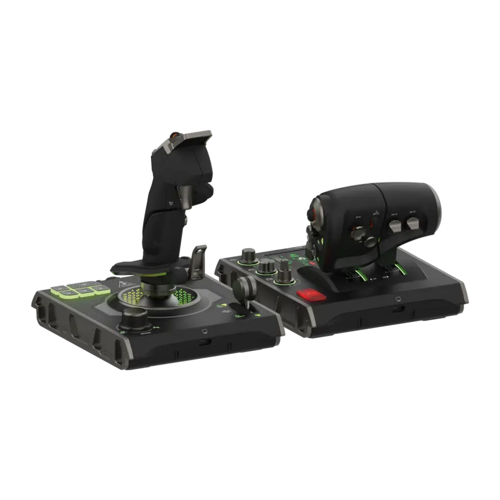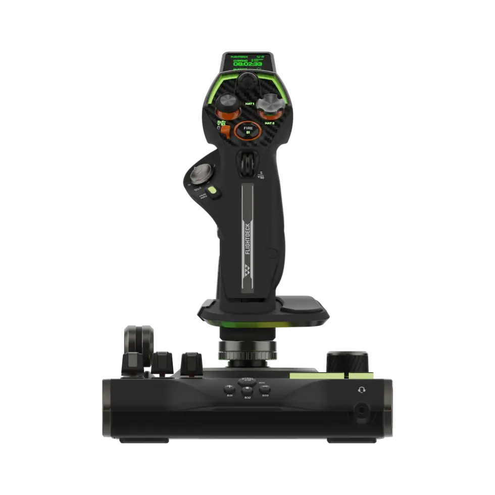 The VelocityOne Flightdeck is “comprised of two individual USB-connected devices with a complete set of controls for precision dogfights in the air or navigating in six degrees of freedom in space.” The stick measures 6.97” x 8.50” x 9.22” and weighs 3.22 lbs., while the throttle is listed at 7.00” x 8.17” x 5.28” and tips the scales at 3.33 lbs.