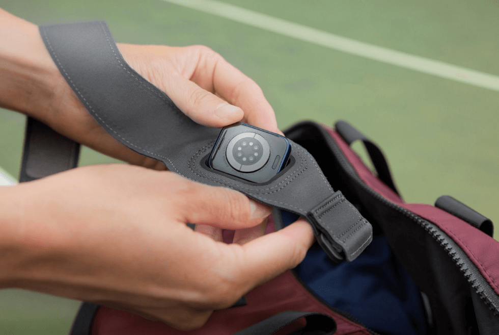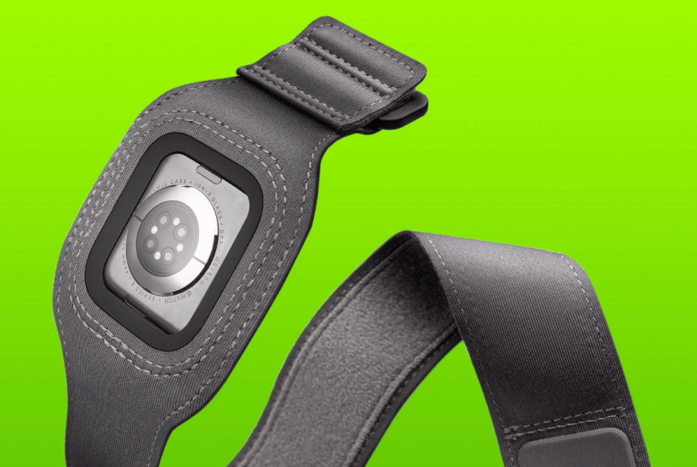 Just remove the straps and slip your Apple Watch into the integrated holder. The open-face design protects the case from impacts but leaves the touchscreen and digital crown accessible. The material remains comfortable even with a snug fit. Now that the smartwatch is away from your wrist, it’s less likely to bump into gym equipment.