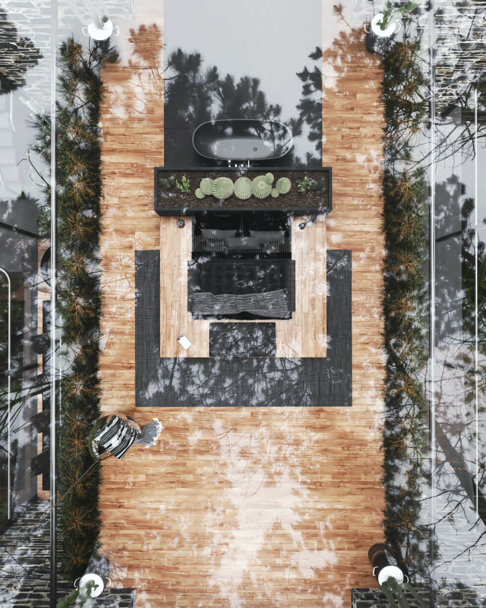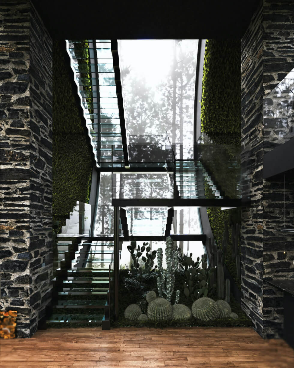 In terms of interior space, each building of the Twin Sisters home is similar. The ground floor serves as the public space and the upper is the private space where you have the bedroom and bathroom. A staircase connects the two floors while tall glass walls and windows bring the outside scenery in.