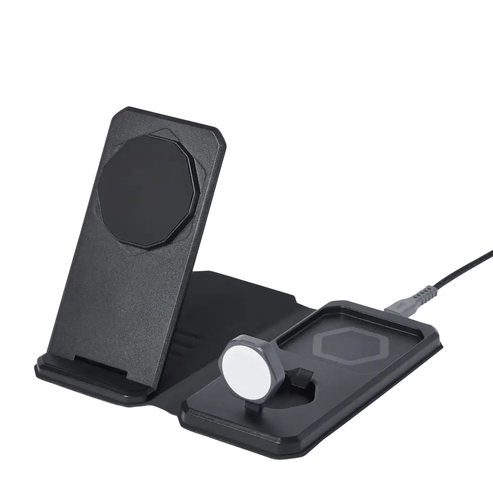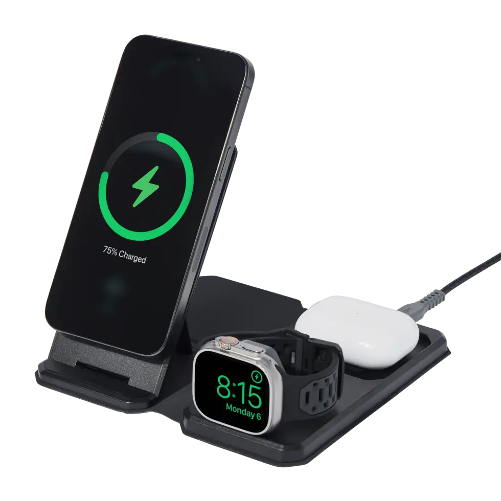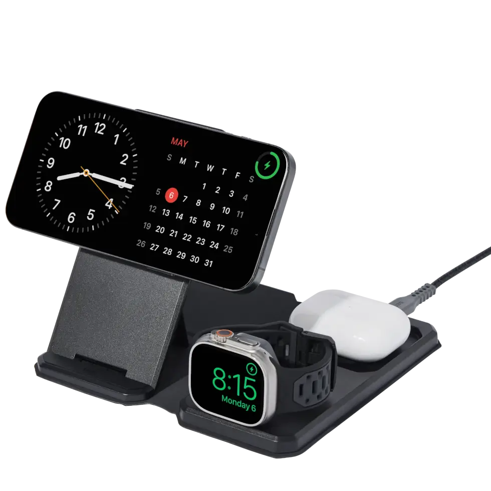 This charging pad is designed with travel in mind. It’s lightweight, sleek, and best of all, folds to half its size for compact storage inside your bag. It opens like a book to reveal three different charging slots inside. One is a collapsible magnetic (MagSafe compatible) charging stand that delivers 15W of wireless charging.