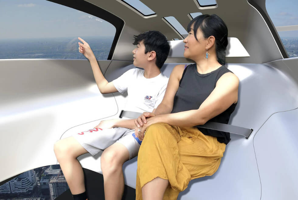 It may not look like a small private jet, but its aerodynamic silhouette has aviation DNA from all angles. Given it will be soaring above the ground, the sleek curves are not only for aesthetics. A single gullwing door lifts up to welcome you into the spacious cabin.