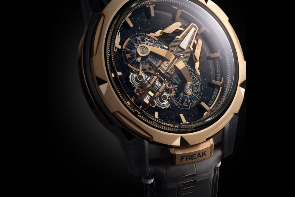 Just like the latter, Ulysse Nardin imbues the Freak S with a space motif that looks absolutely jaw-dropping. The timepiece is presented in a 45 mm round case crafted out of ceramic and titanium in black DLC. It flaunts a 5N rose gold bezel that you can turn to adjust the time.