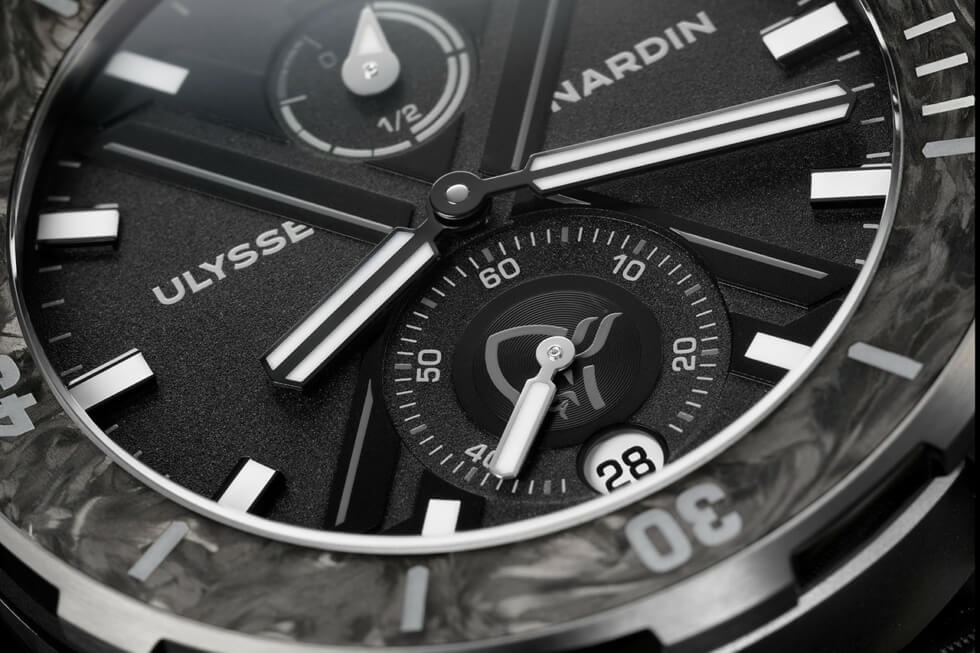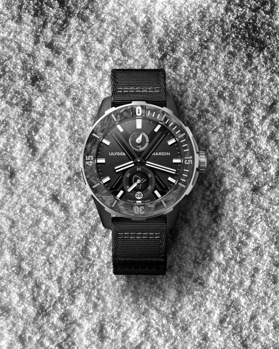 Applied hour markers and hands feature Super-LumiNova treatment for low-light visibility. A power reserve indicator is at 12 o’clock, while the small seconds sub-dial and circular date window share the space at 6 o’clock. Finally, Ulysse Nardin gives the DIVER NORRØNA Arctic Night a black strap fashioned out of 100% recycled fishing nets with gray stitching.