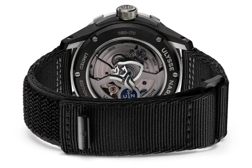 Its open-work design at the bottom showcases the UN-118 self-winding caliber with a 60-hour power reserve. The uni-directional rotating bezel features a mottled Carbonium insert. The DIVER NORRØNA Arctic Night’s matte black sandblasted dial sports Ulysse Nardin’s signature double X embossed dead center.