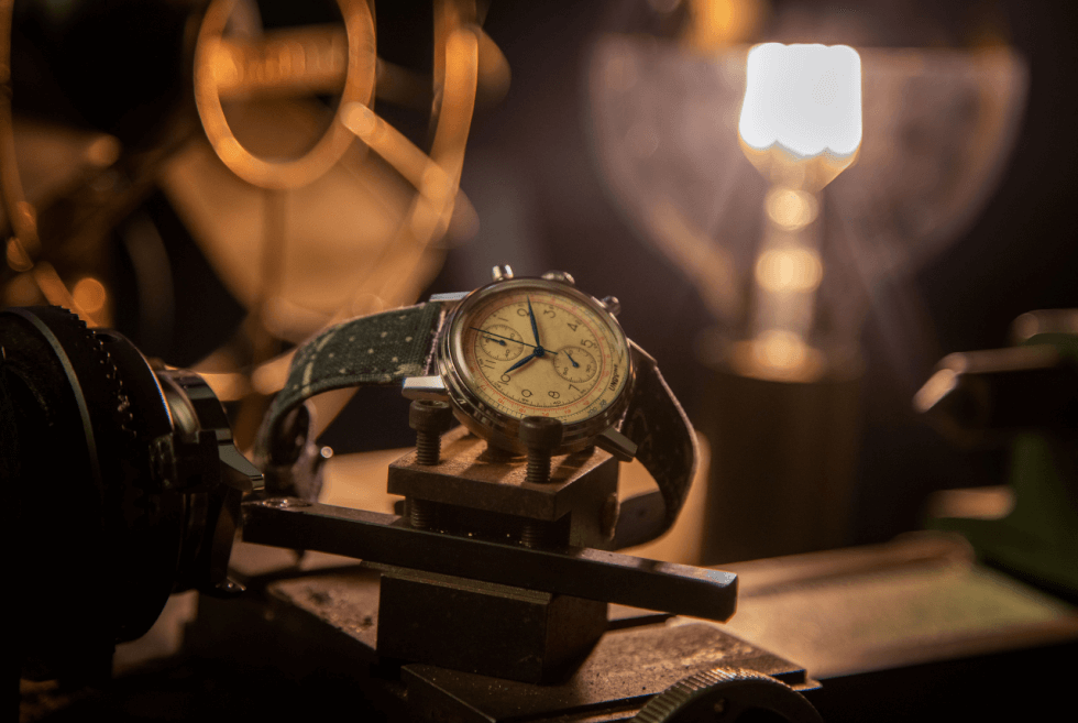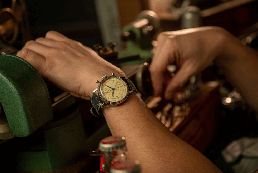Next up, on the right side of the caseband is the fluted crown that sits in between two pushers. As we shift our attention back up top, you’re greeted with a striking dial that touts a layer of patina. If not for its shiny case, one would easily think that this was taken straight out of an antique shop somewhere.