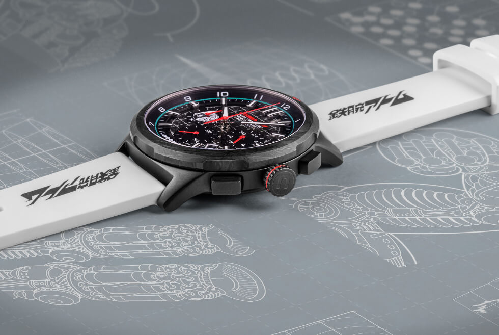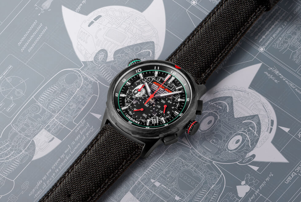The timepiece comes in a 42.5-mm 316L stainless steel case with a coat of black DLC. It measures 48 mm lug-to-lug and 12.10 mm from the sapphire crystal of the face to the other on the exhibition cashback. UNDONE indicates that the bezel is forged carbon fiber for that lightweight toughness and an homage to Mighty Atom’s composite material construction.