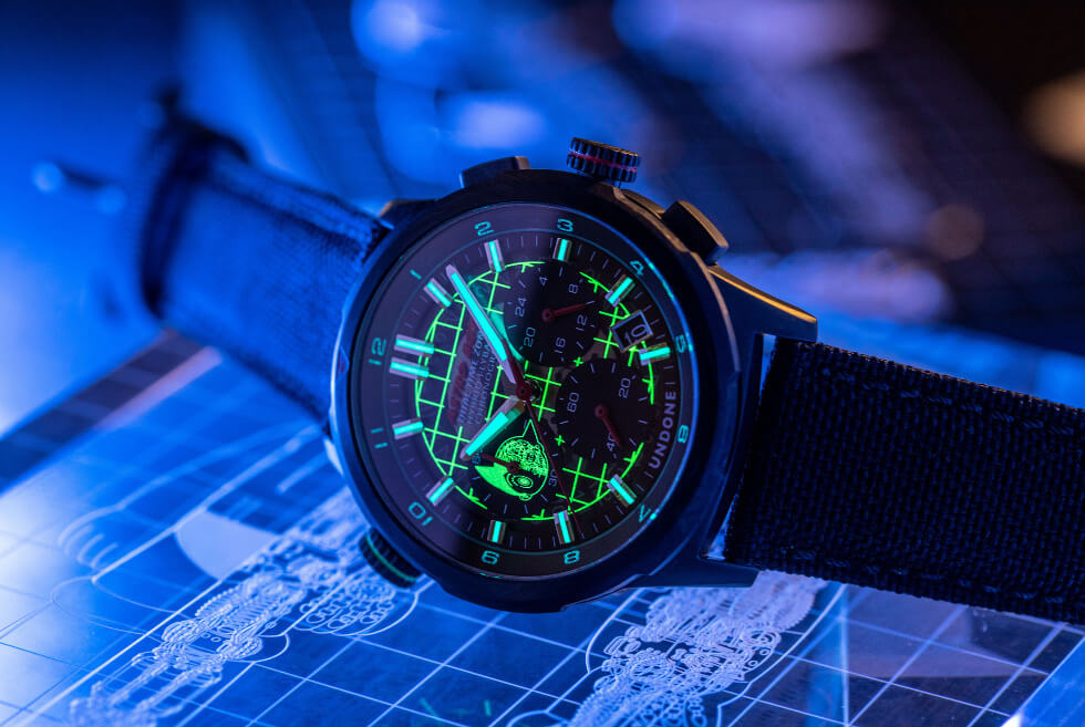 UNDONE notes that this is their first model with a dual time zone function. You’ll find a secondary crown marked by a green band at 10 o’clock which rotates the inner bezel with Arabic numerals. A green outer ring separates this from the minute track and baton hour markers.