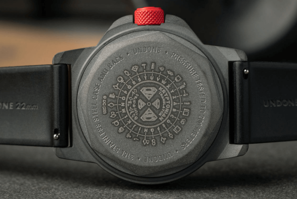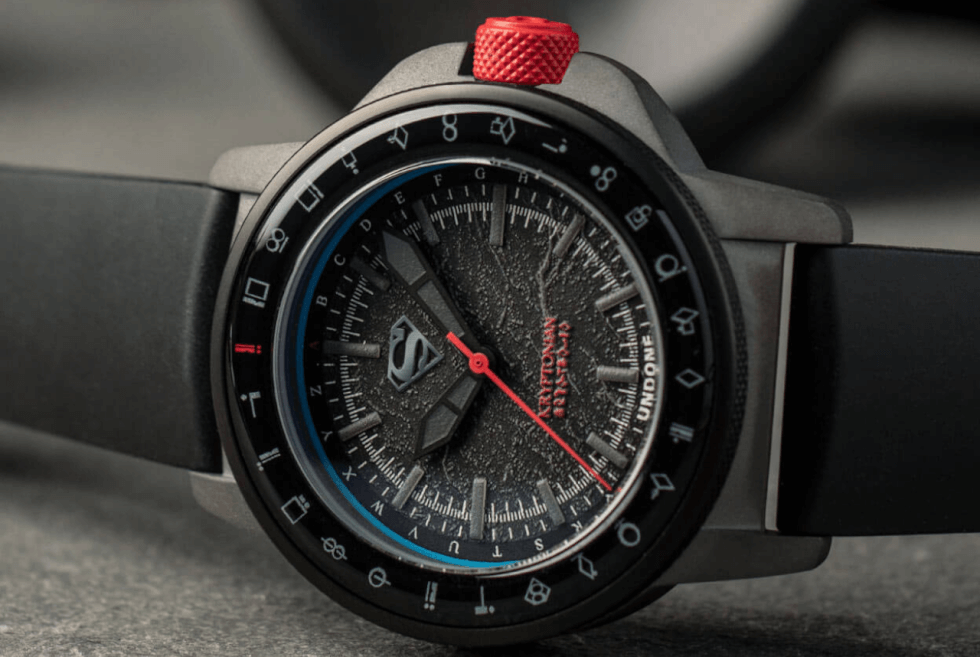 Although tones of black and grey dominate the entirety of the watch, UNDONE did not forget to add some accents of the superhero’s iconic colors. We have blue on the perimeter of the flange. Next is the red on the Kryptonian character for “A” on the bezel, the second hand, and on the cerakoted crown.