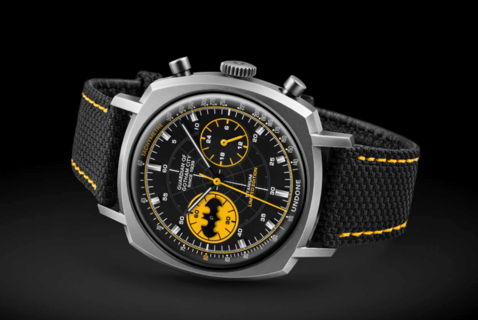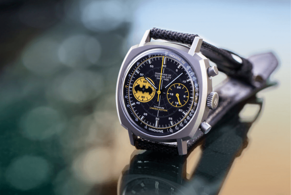 The angular edges of its grade-2 titanium case give off a tactical vibe, which is exactly how the hero likes to operate. It wouldn’t be a Batman watch without the bat symbol and UNDONE knows it.