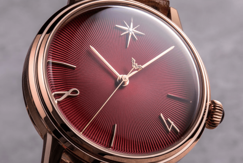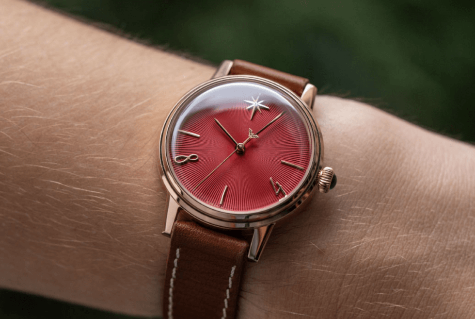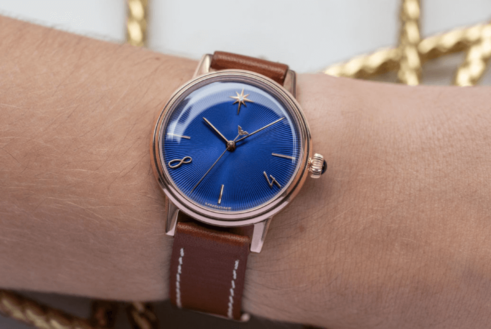 Just below the hardened K1 domed crystal is the sunburst dial in chatoyant blue or red that looks stunning when the light hits it from different angles. UNDONE then goes for an eight-pointed star symbol to replace the 12 o’clock hour maker, which holds a genuine diamond at the center.