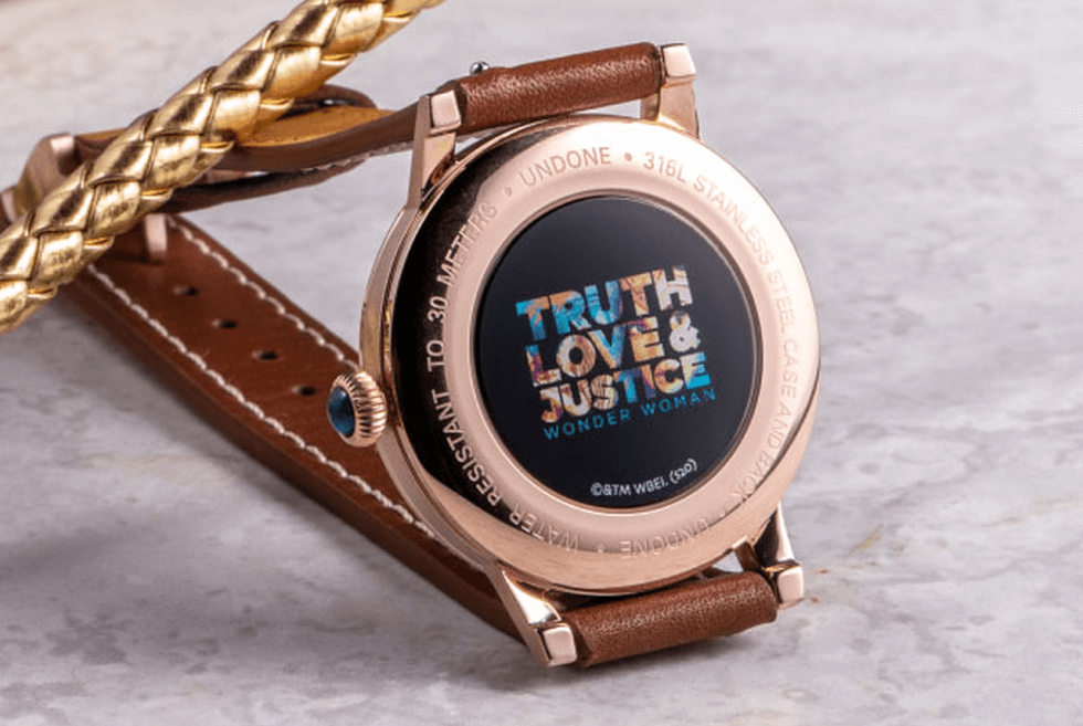 The round 316L stainless-steel case gets a glossy rose gold finish that extends to the crown, caseband, and caseback. With the watch facing down, you can read three powerful words the daughter of Zeus and Hippolyta lives by — Truth, Love, and Justice.