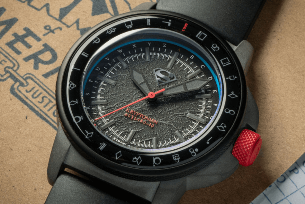 The gimmick here is as the namesake implies, decoding Kryptonian writing. Instead of your typical markers on the bezel, there are symbols. In their default position, these lineup with the corresponding letters of the alphabet on the outermost ring of the meteorite texture dial.