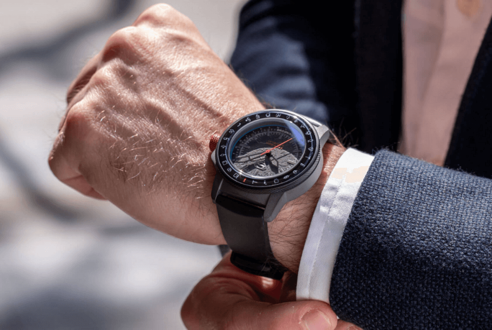 To accommodate the artwork, the watchmaker goes for a bigger 43 mm 316L stainless steel case, caseband, and caseback in black. This gives it a rugged appeal which is further enhanced by the durable ceramic bezel insert and scratch-resistant sapphire crystal.