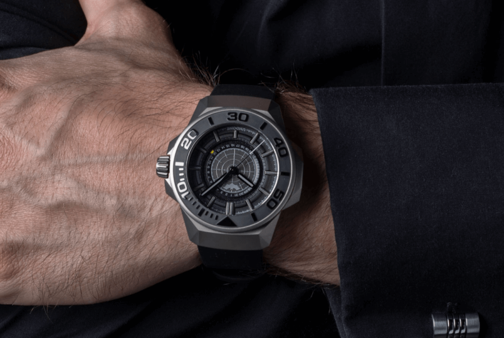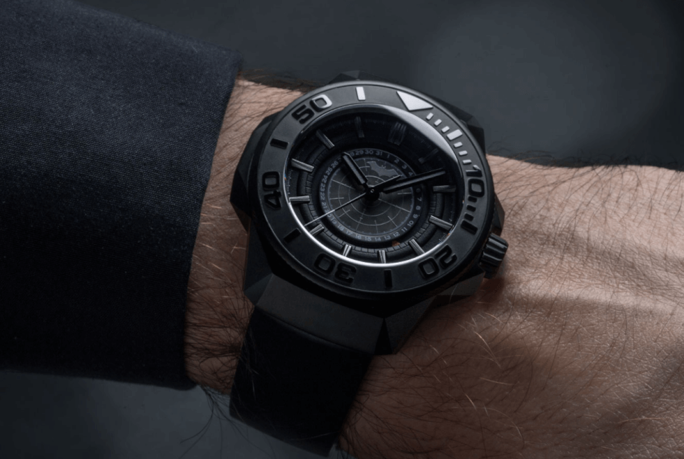 You can find it on the caseback as a medallion insert, an engraving on the screw-down crown, and on the semi-transparent section of the dial at 12 o’clock. Upon closer inspection, the markings actually resemble the visuals on a radar.