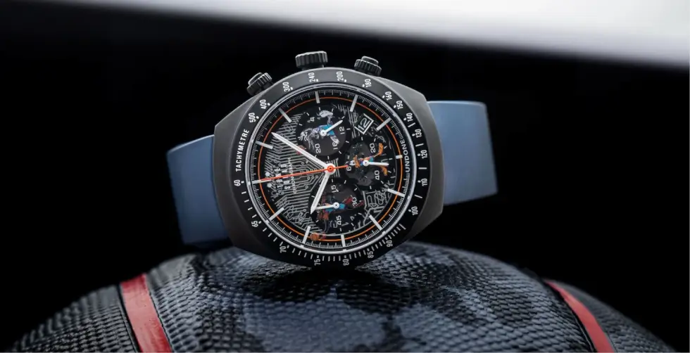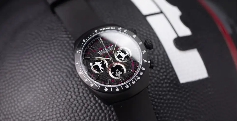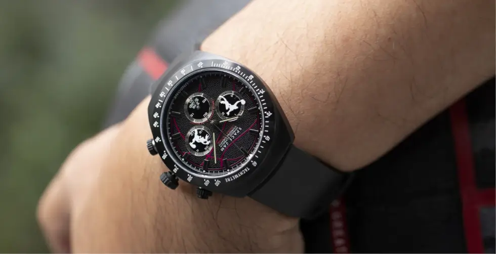 The Hong Kong-based watchmaker is building only 300 units of this model. It is presented in blackout colorway with elements in red, white, and silver for contrast. The dial sports a basketball grip texture and holds three sub-dials with silver borders. As hinted at earlier, the strap is also in black.