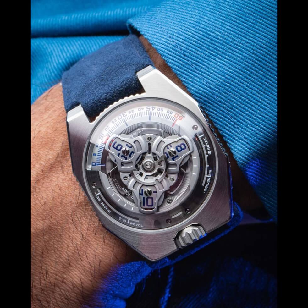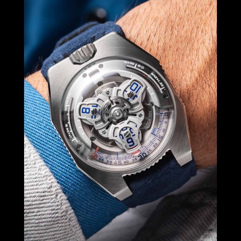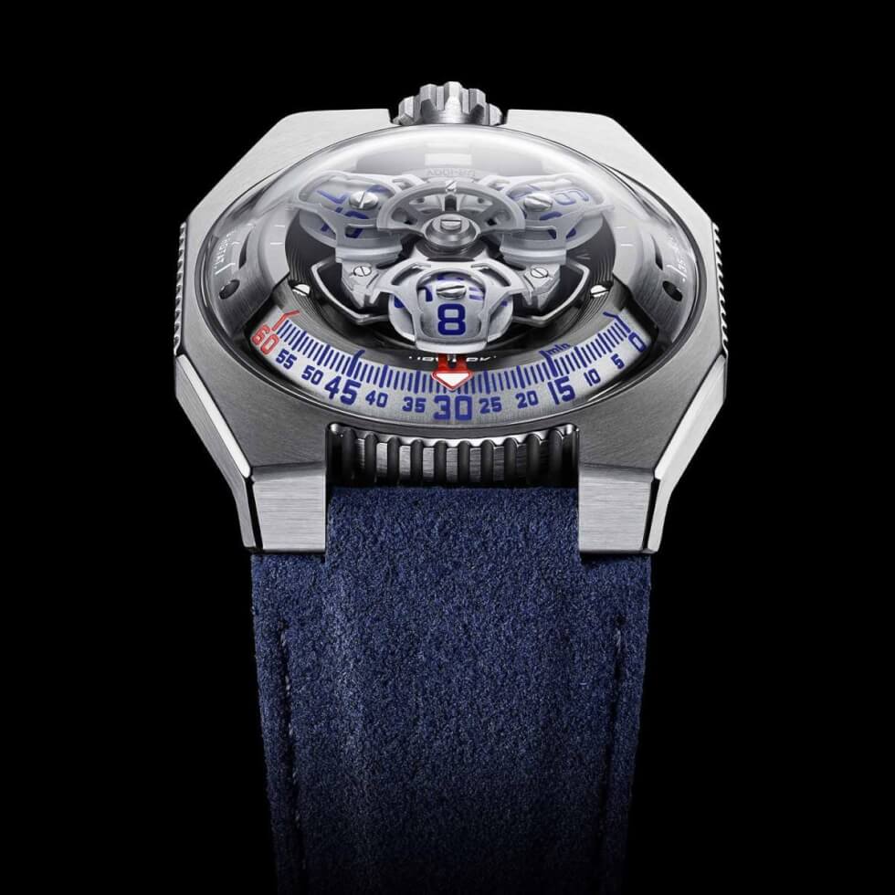Each of the engravings of Arabic numerals for the hour discs as well as the minute markers glow a bright blue in the dark courtesy of the Super-LumiNova lume. The shot-peened aluminum carousel turns while the hours spin on an ARCAP alloy disc. Meanwhile, Urwerk’s UR 12.02 automatic calibre keeps the UR-100V Iron operational on top of the 48-hour power reserve. Finally, we have a navy blue Alcantara strap for stylish comfort.