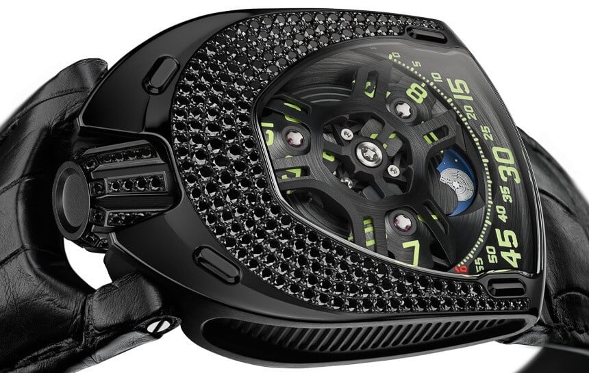 At the opposite end of the steel and titanium case a simple yet elegant cluster of diamonds makes the entire piece look extra glamorous. The sapphire crystal is water resistant to 3 ATM, and the hand-stitched alligator strap keeps the watch safely on the wrist at all times. The movement is an in-house caliber UR 6.01, which also features a moon phase complication.