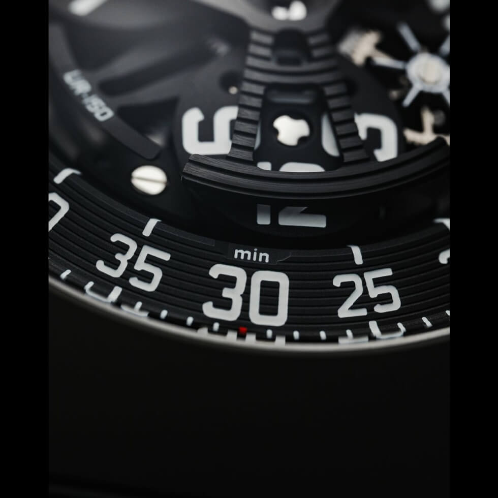 The UR-150 Scorpion boasts a wickedly fast retrograde action via a spring trigger. This allows the minute pointer to quickly initiate a 240-degree sweep back alongside a 270-degree rotation of the hour discs to show the succeeding number. URWERK expresses all the indices in Arabic numerals and covers the dial with a sapphire crystal with an anti-reflective coating.