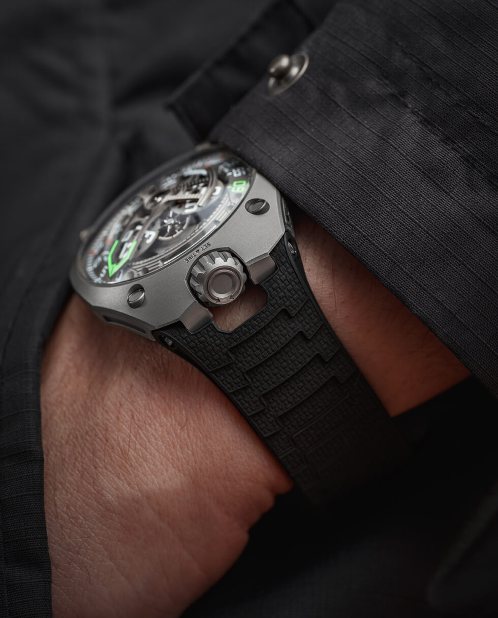 We’re looking at a 42.49 mm x 52.31 mm x 14.79 mm titanium case. We would like to describe the shape as that of a turtle shell with a textured case band. There are two variants available: Titan and Dark. The first is in the standard gray tone of the metal with green accents, while the latter sports a stealthy black PVD coat with red elements.