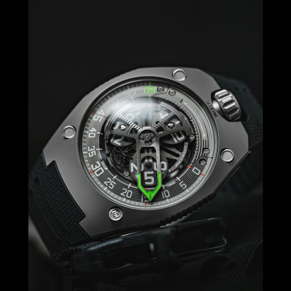 Behind this mesmerizing complication is an in-house UR-50.01 self-winding movement. The automatic caliber has 38 jewels with a Swiss lever escapement and beats at 28,800 vph. To adjust the time, users can do so via the three-position screw-down crown mounted at the top. Finally, the UR-150 Scorpion ships with a Kiska rubber strap.
