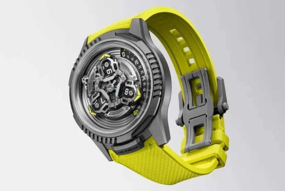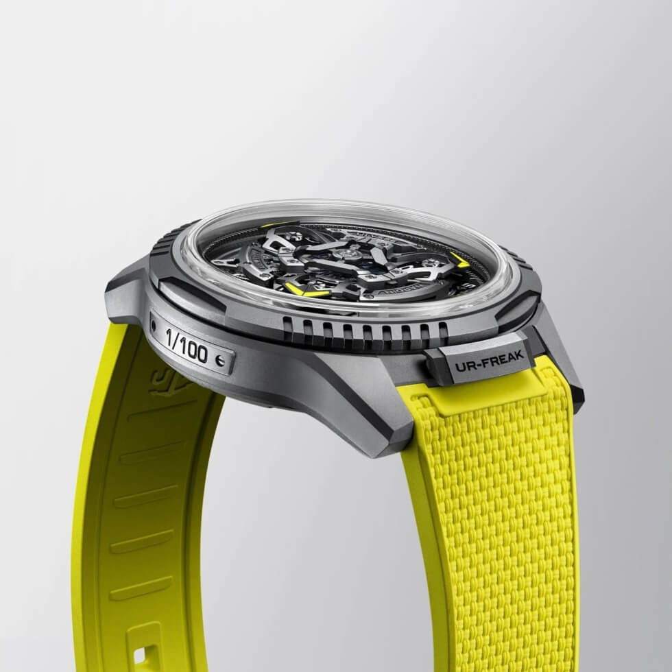Running the elaborate show is an in-house Caliber UN-241 beating at a frequency of 3 Hz (21,600 vph). The self-winding movement features 263 components and 25 jewels, with a 90-day power reserve. Each UR-FREAK ships with a yellow textured rubber strap and titanium deployant clasp.