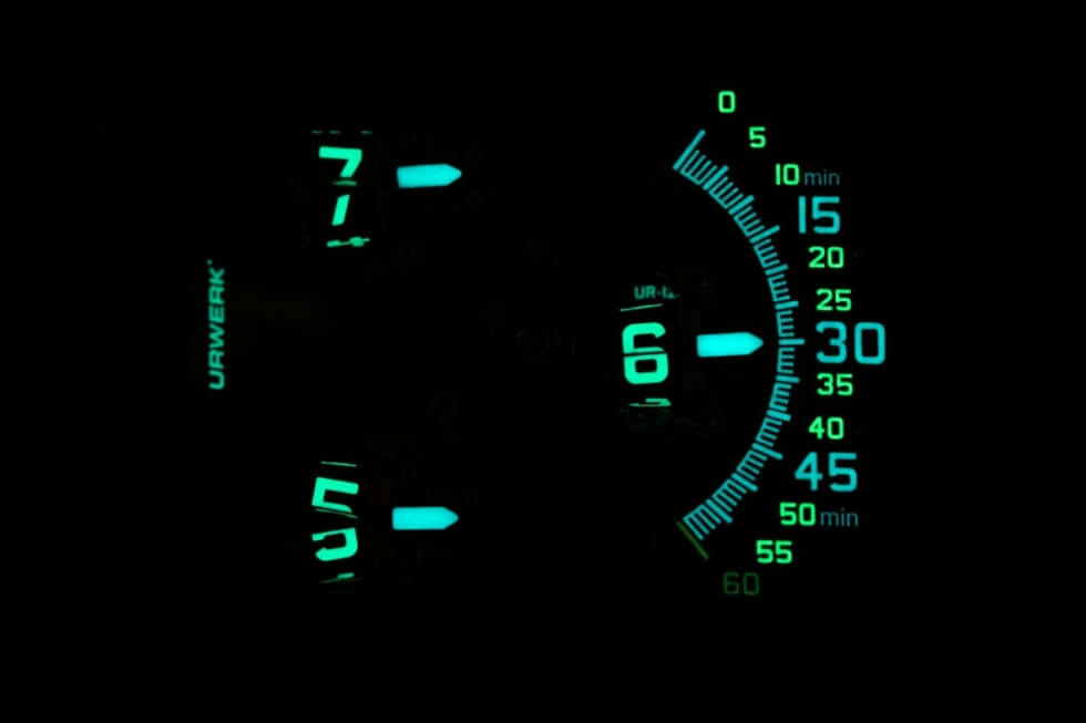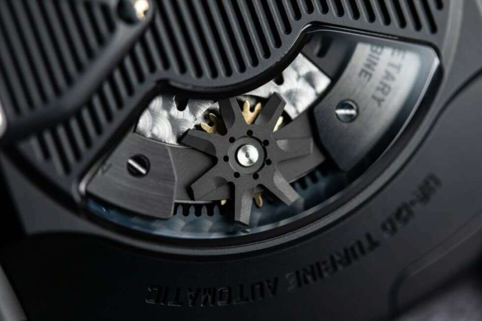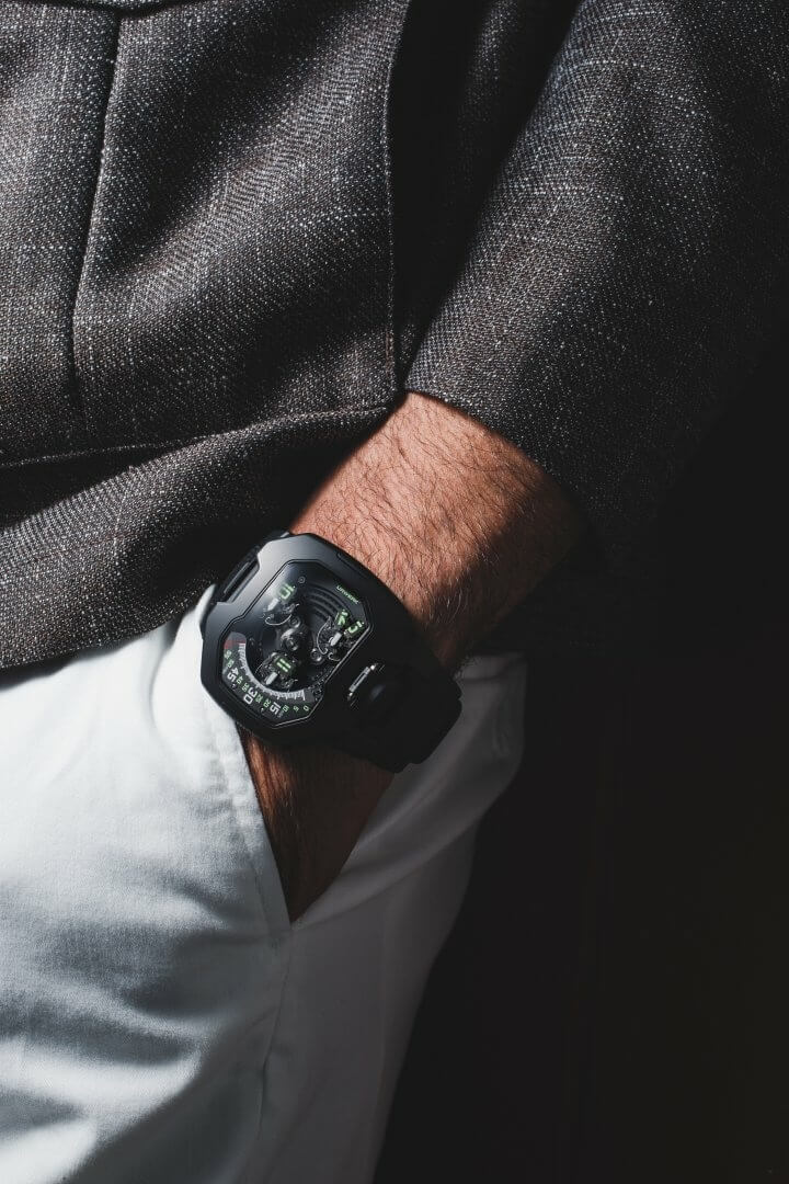 We understand their watches are usually on the chunky side, but the tweaks they have made aim to change that. The UR-120 Space Black touts a 47 mm x 44 mm x 15.8 mm case fabricated out of titanium and paired with a steel bezel. A Stygian DLC treatment ensures it lives up to the name.