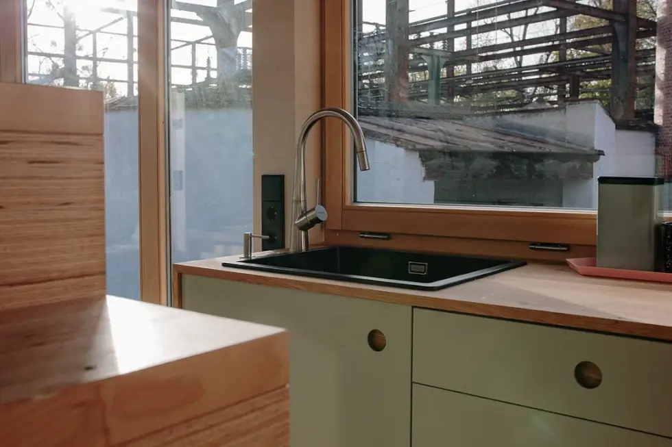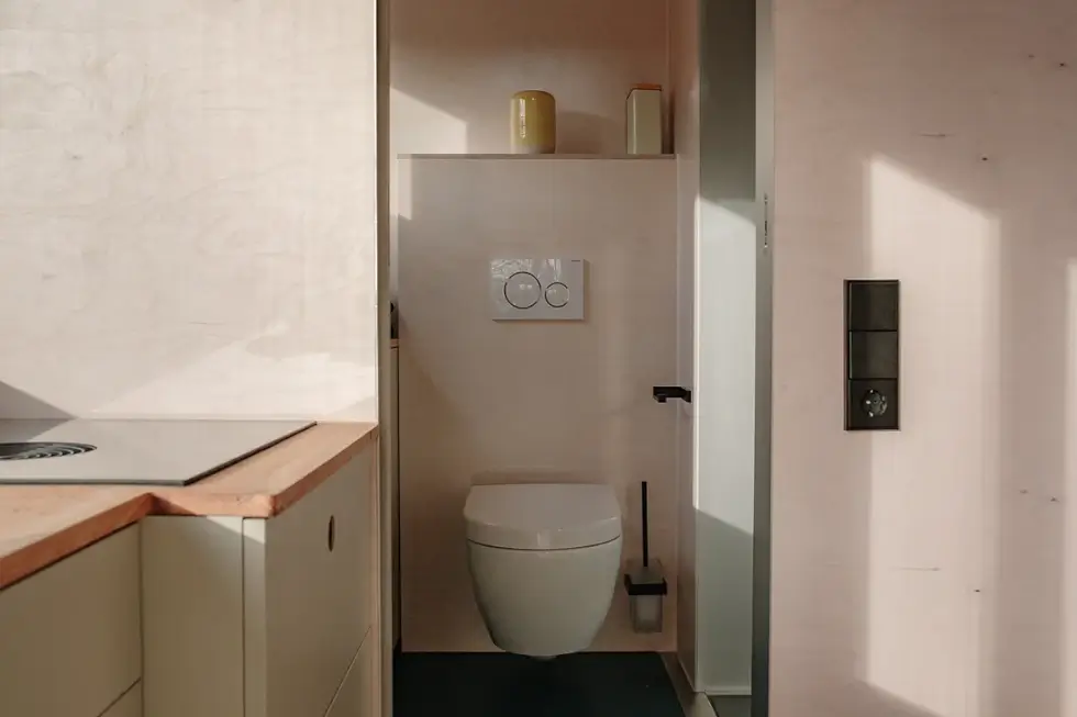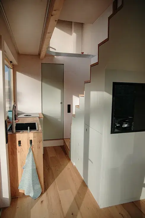 German builder Vagabundo constructed this tiny home with a focus on maximum flexibility and versatility. Its innovative design allows the roof to rise to a height of 20.3 ft, creating a fully-fledged second floor and expanding the interior space to 300 sq. ft. The bulky elements of the lifting system are tucked neatly in corners and cupboards, so they don’t disrupt the minimalist and clean aesthetics of the home.