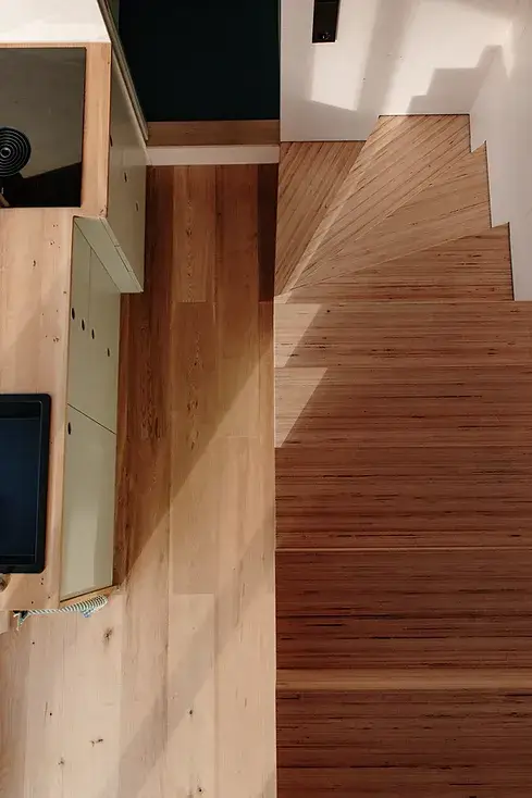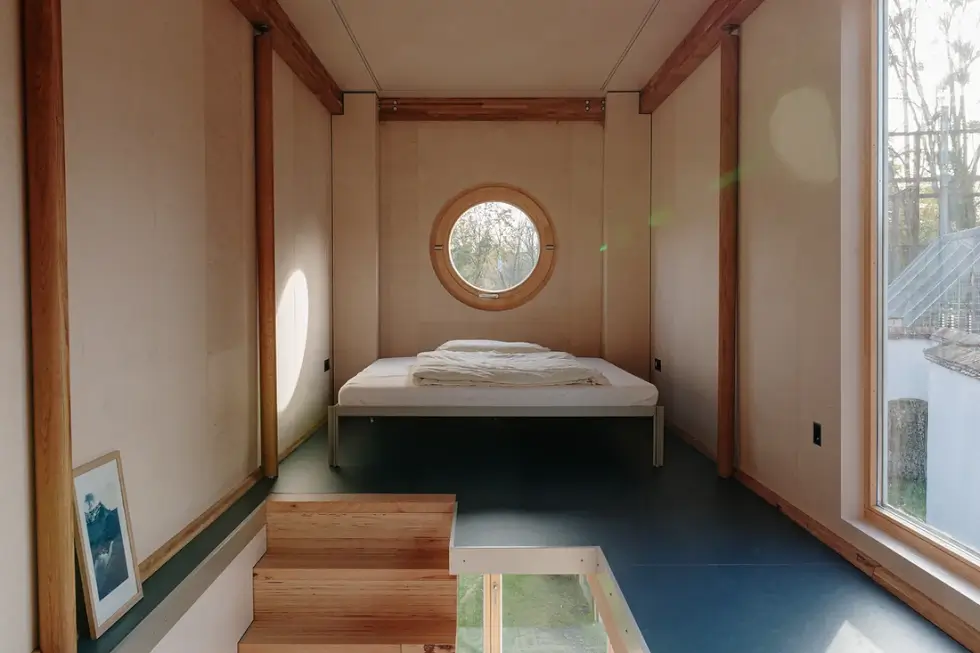 The top floor, on the other hand, hosts a wooden bed for two, an ergonomic height-adjustable folding table, a closed workspace/retreat with Porthole and panoramic window, and ample storage spaces. The Vagabundo Flex is available in three distinct installation configurations. The first is to keep the house trailer-friendly for mobility and the second option involves resting the home on sturdy pillars for extra storage space and a raised terrace. Lastly, is to place the home on ground level onto a prepared foundation using a crane.