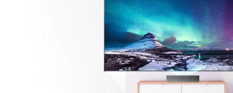 Design-wise, it’s housing has a rectangular form factor with curved edges. Elsewhere, premium acoustic fabric wraps around the middle frame. In the meantime, audio output relies on two 30W stereo speakers tuned by Harman Kardon. The device also supports DTS-HD and Dolby Audio for immersive sound.