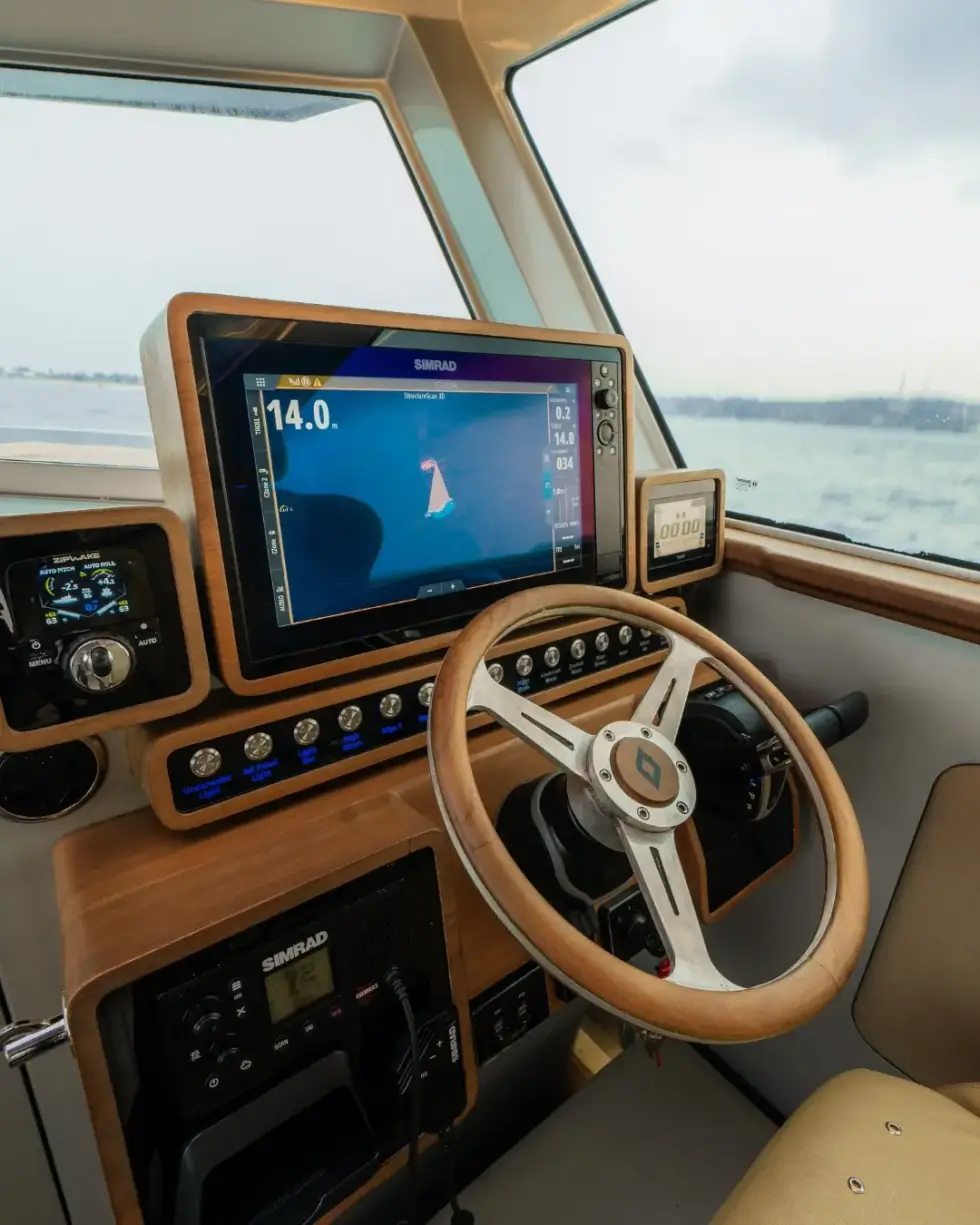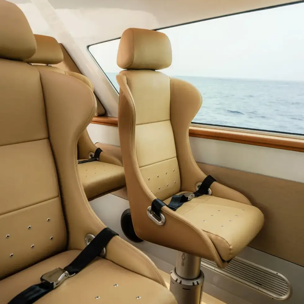 Although notably rare these days, people still generally call these vessels speedboats. Capable of cruising anywhere between 32 knots to 42 knots, this bad boy is rightfully one by definition. It is outfitted with twin 425-horsepower Yamaha outboard engines and benefits from a Zipwake Dynamic Stability System. It has a range of about 255 nautical miles.