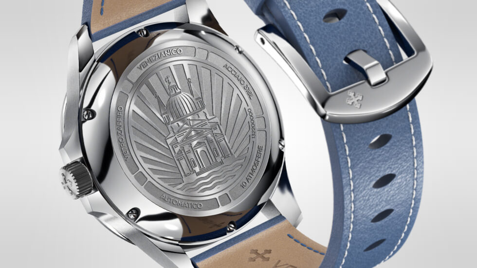 Governing the Redentore Riserva di Carica’s five-hand operation is a 29-jewel, 21,600 bph, Seiko NE57. The self-winding movement boasts a 41-hour power reserve. Finally, Venezianico pairs the watches with genuine leather straps and a stainless-steel pin-buckle closure system.