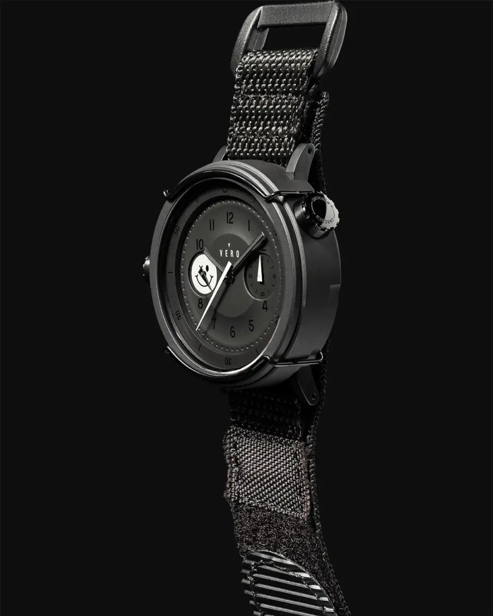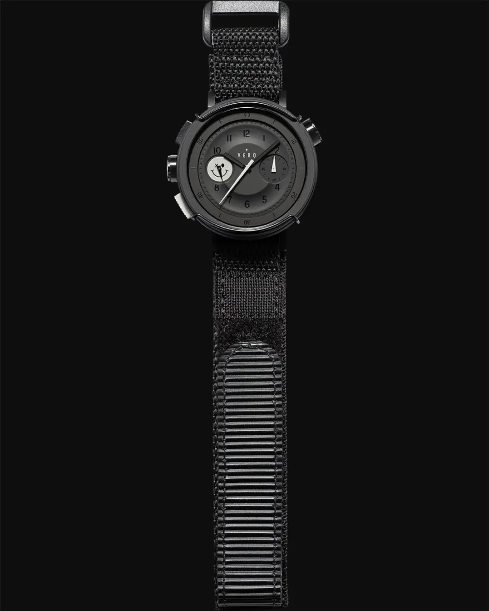 “The Limited Edition Hooligan Nightfall is meant to be a phantom on your wrist. Its midnight black CeraKote case is dashed by light gray accents on the lower push button, second and chrono hands, and of course, the Hooligan smiley,” writes VERO.