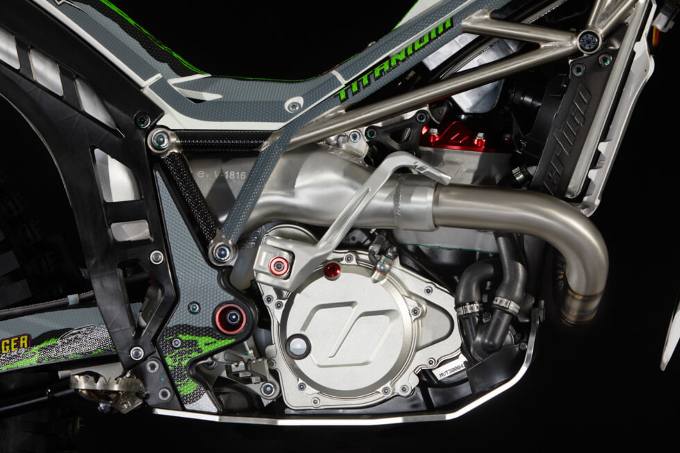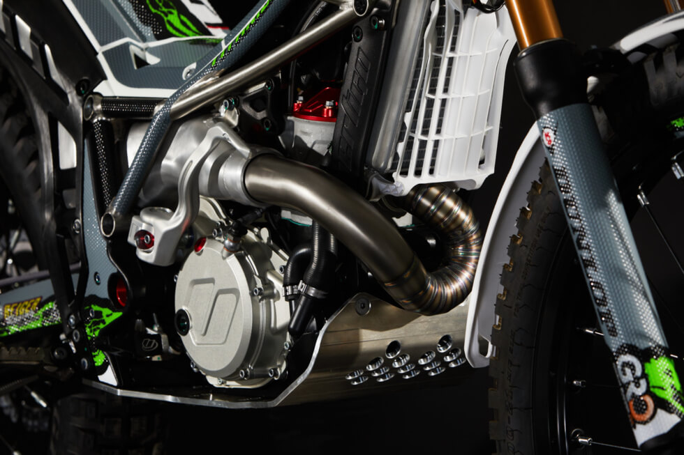 You can get it with a 247 cc EFI or 300 cc EFI two-stroke single-cylinder engine. This is mated to a six-speed transmission (4 gears developed and tuned for trials). The powertrain produces 31 horsepower with 35 lb-ft of torque. As noted earlier, the frame, detachable mechanized clutch cover, and muffler are all titanium.