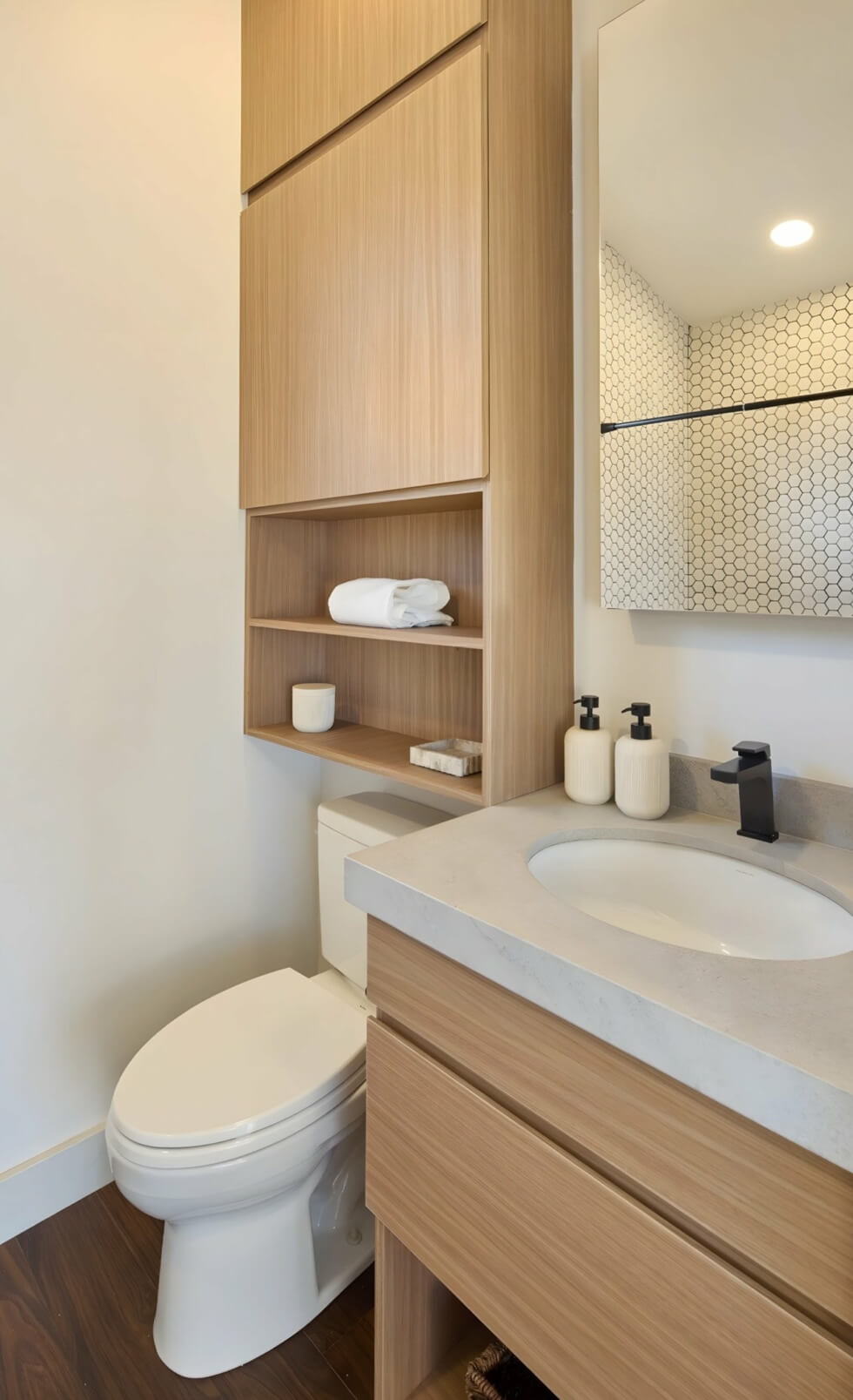 The walls have built-in shelving and cupboards to store items and keep the floor space tidy and neat. But instead of bulky cabinetry, Vettel Haus features custom millwork that maximizes vertical space. This makes the interior feel and look large.