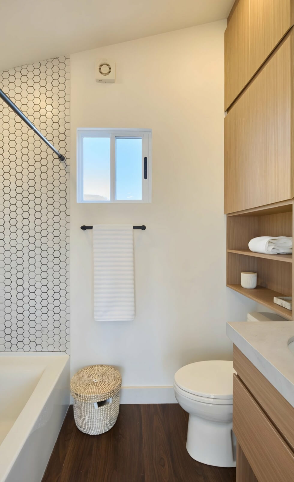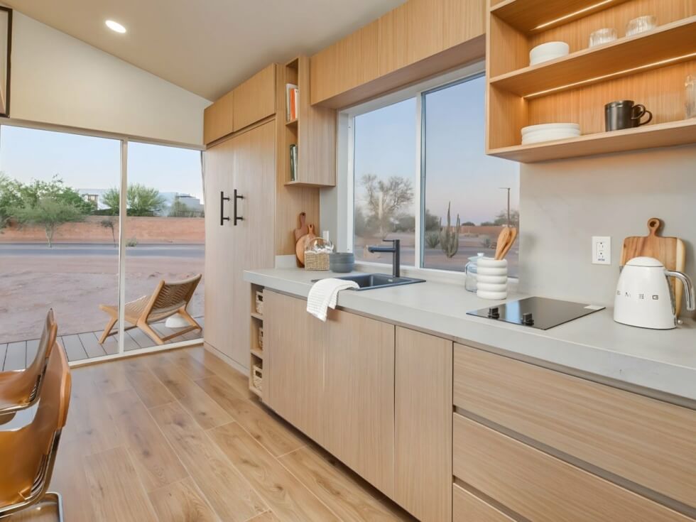 Moreover, the neutral tones and wood finishes, combined with well-placed glazing that provide natural light, give the home a welcoming atmosphere. This house also features a large sliding glass door on one end that further opens up the interior space to the outside to make it feel airy. This door leads to a small patio ideal for al fresco dining or relaxing.